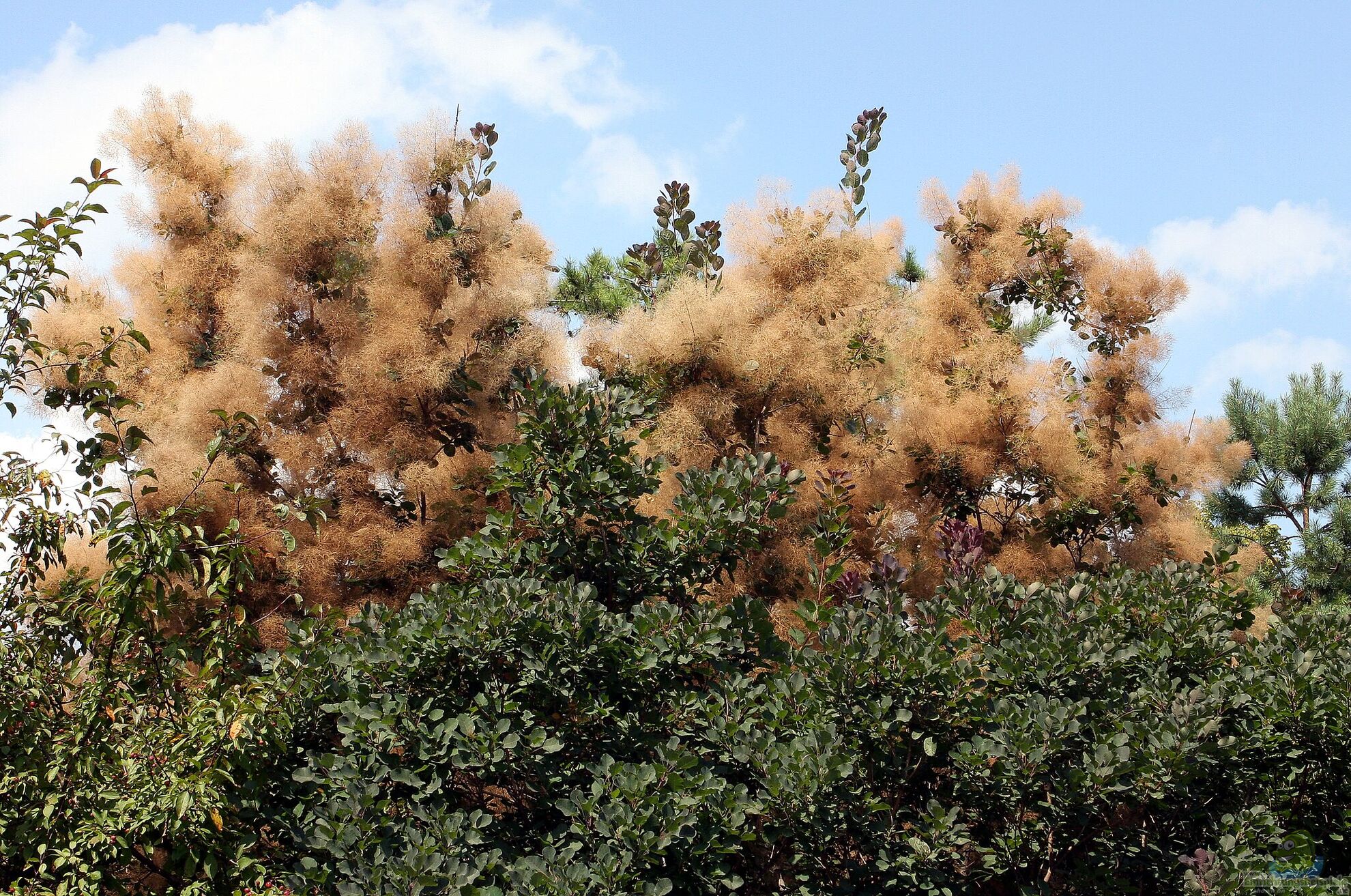 Der Cotinus coggygria ist ein sommergrüner Strauch, der eine Höhe von etwa drei bis fünf Metern erreichen kann. Er zeichnet sich durch seine runde, breitbuschige Wuchsform und seine charakteristischen, rauchigen Blütenstände aus, die ihm seinen deutschen Namen „Perückenstrauch“ verleihen. Im Sommer entwickelt der Strauch kleine, gelbliche Blüten, die in Rispen zusammenstehen. Nach der Blütezeit erscheinen die unverwechselbaren, flauschigen Fruchtstände, die wie eine Wolke aus zarten Fäden wirken und den Anschein erwecken, als trüge der Strauch eine „Perücke“.