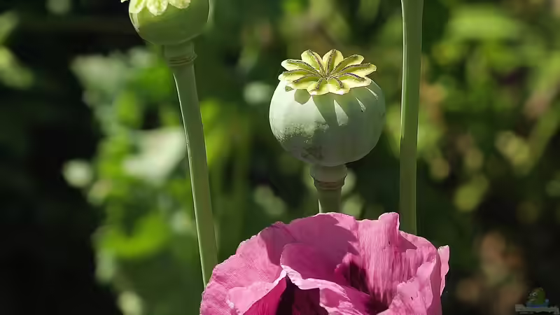 Papaver somniferum eignet sich gut für die Pflanzung in der Nähe von Gartenteichen, solange der Boden gut durchlässig ist und die Wurzeln nicht permanent im Wasser stehen. Der Schlafmohn bildet einen schönen Kontrast zu anderen Teichpflanzen durch seine auffälligen Blüten und seine architektonisch anmutenden Samenkapseln. Die Blüten locken zudem Bienen und Schmetterlinge an, was deinem Garten eine zusätzliche ökologische Vielfalt verleiht.