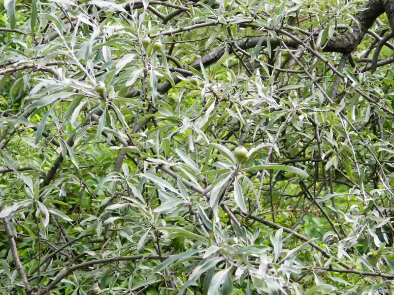 Die Weidenblättrige Birne zeichnet sich durch ihre charakteristischen, weidenähnlichen Blätter aus, die ihr auch den Namen geben. Die schmalen, lanzettlichen Blätter sind silbrig-grau bis grün und verleihen der Pflanze ein einzigartiges, elegantes Aussehen.