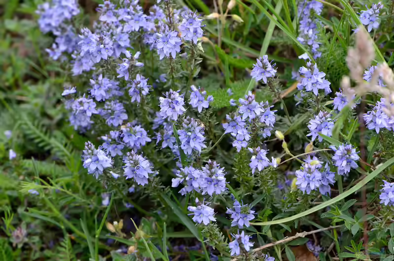 Einmal etabliert, ist Veronica prostrata ausgesprochen trockenheitsresistent. Sie benötigt kaum Pflege, außer einem gelegentlichen Rückschnitt nach der Blüte, um die Pflanze kompakt und vital zu halten.