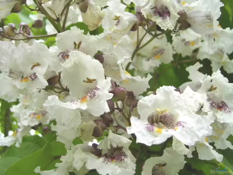 Ein echtes Highlight des Catalpa bignonioides sind die prächtigen Blüten, die sich im Juni und Juli zeigen. Sie sind weiß, glockenförmig und besitzen eine innere Zeichnung mit violetten und gelben Punkten. Diese auffälligen Blüten wachsen in großen Rispen und ziehen viele Bestäuber wie Bienen an.
