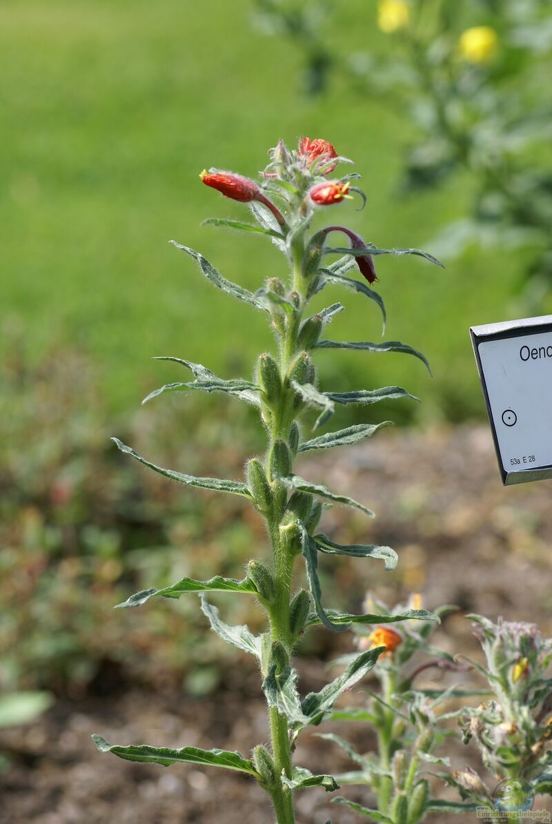 Die Rote Nachtkerze zeichnet sich durch ihre aufrechten, verzweigten Stängel aus, die eine Höhe von 30 bis 100 cm erreichen können. Die schmalen, lanzettförmigen Blätter sind grün und sorgen für einen ansprechenden Kontrast zu den auffälligen Blüten. Die Blüten selbst haben einen Durchmesser von etwa 3 bis 5 cm und leuchten in intensiven Orangetönen mit roten Akzenten. Ein besonderes Merkmal der Blüten ist ihr Wandel: Am ersten Tag erscheinen sie orange, während sie sich in den folgenden Tagen zunehmend rot färben. Diese Farbveränderung ist ein echtes Highlight im Garten.