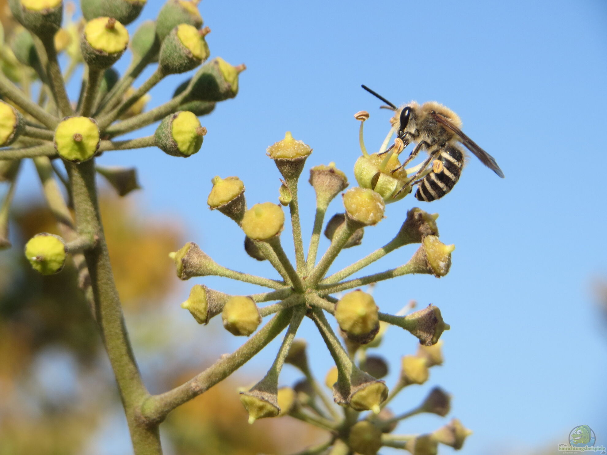 Neben Pollen wird auch Nektar aufgenommen, der als Energiequelle dient. Dabei spielt die Biene eine wichtige Rolle bei der Bestäubung des Efeus.