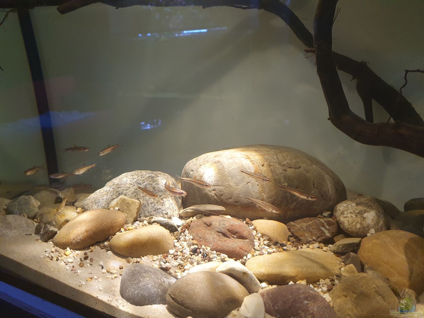 Als Einrichtung sollten Zonen mit einer dichten Bepflanzung und Bereiche mit freiem Schwimmraum vorhanden sein. Es sollten Versteckmöglichkeiten aus Holz und Steinen vorhanden sein.