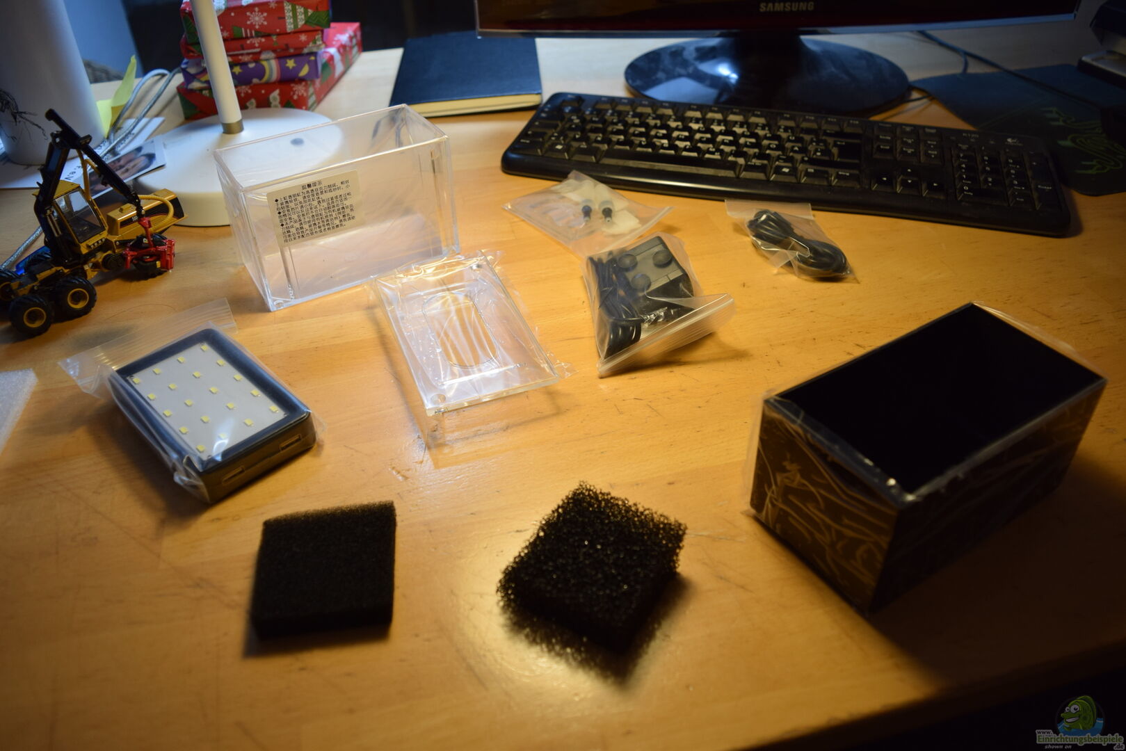 Ich würde mal sagen, dass das ganze hier gezeigte System eine Besonderheit ist. Es wird als kleinstes Aquarium der Welt angepriesen, was es wohl auch ist. Das System ist, wie der Name schon sagt, ein Komplettsystem aus einem Acrylbecken, einem gar nicht mal so kleinem Filter mit Kammersystem und Pumpe und einer Lichteinheit, die in 3 Stufen schaltbar ist, von 3-10 Watt, also für so einen kleinen Raum eine ordentliche Beleuchtung darstellt. Der tatsächliche Inhalt des Acrylbeckens sind 780 ml, die des Filterbeckens 680 ml. Somit ergeben sich knapp 1, 5 l Volumen.
