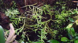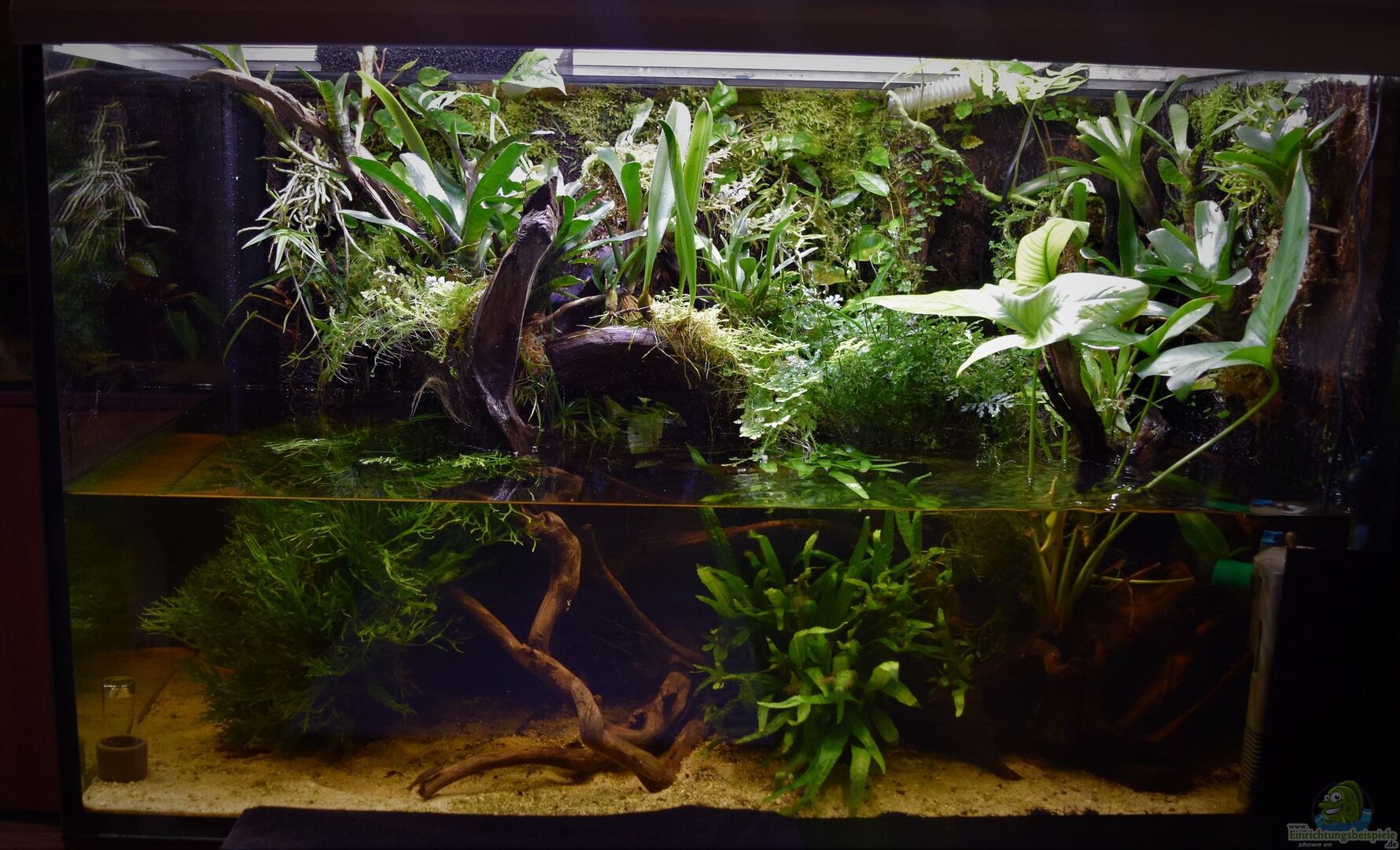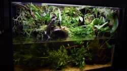 Hier wurde ein klassisches Aquarium zum Aquaterrarium umgebaut. In den oberen Bereich wurden Xaximplatten verwendet um die Rückwand zu gestalten. Sie wurden mit Aquariensilikon eingeklebt. 2 der Rückwände sind von aussen mit schwarzer Farbe gestrichen worden. Man kann somit von 2 Seiten ins Becken schauen. Der Wasserstand beträgt knapp 25 cm. Um auch über Wasser Fläche zu schaffen für die Bepflanzung wurden sämtliche Mangrovenwurzeln im Haus, Keller und Garten zusammengesucht und erstmal für knapp ein viertel Jahr in der Regentonne gewässert, um sicherzugehen, dass sie auch unter Wasser bleiben. Der obere Teil steht aus dem Wasser heraus und bildet somit den Landteil.