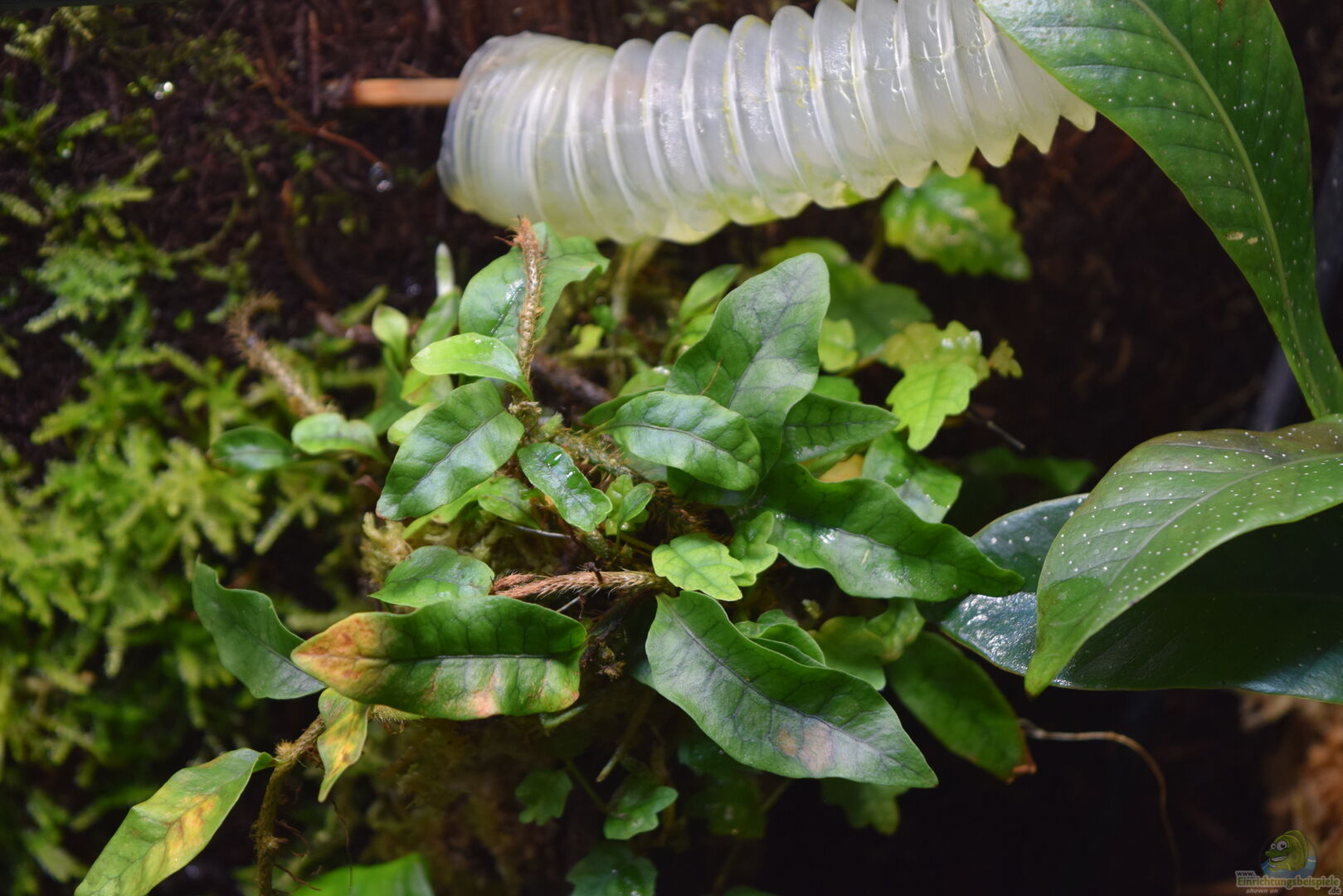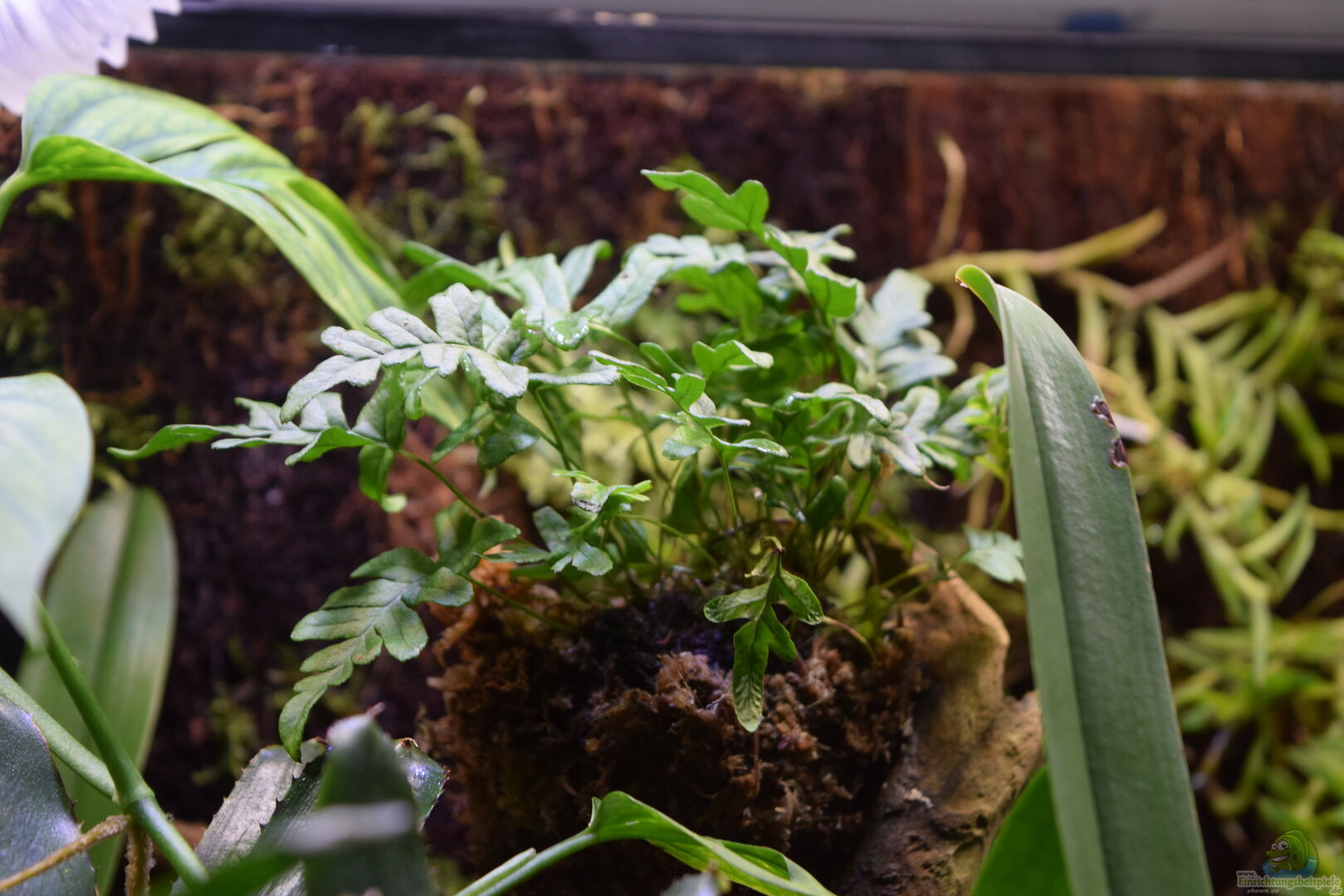 Der Microgramma Farn bekommt zuhends gelbe Blätter, die er regelmässig abwirft. Diese werden aber durch viel kleinere Blätter ersetzt, welche grün bleiben. Ich erkläre mir das so: Die Lichtintesität ist für den Farn einfach zu hoch, so dass er mit kleineren Blättern besser zurecht kommt. Moosen entwickeln sich gut, auch aufgrund der dauerhaften Luftfeuchtigkeit und starken Beleuchtung.