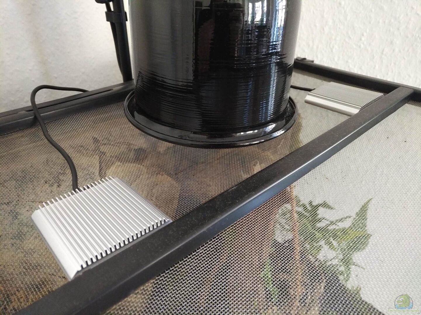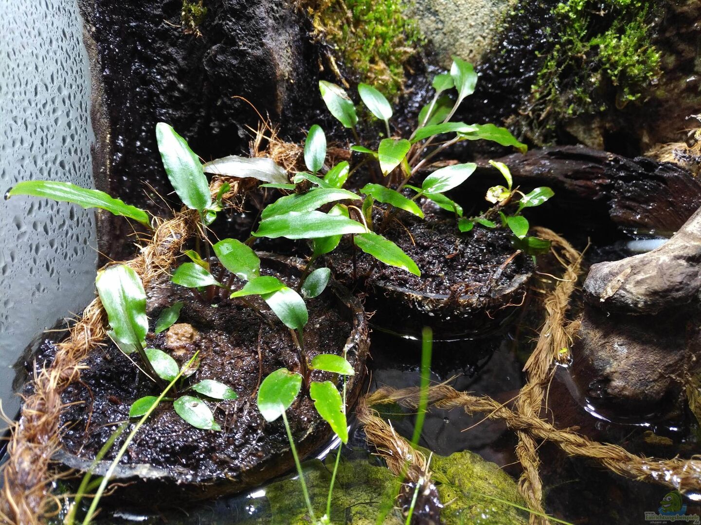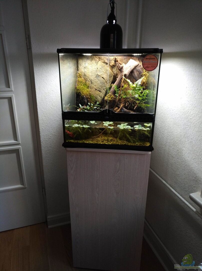 Das Becken ist ein ExoTerra mit den Ma??en 45 x 45 x 45. Der Wasserstand beträgt ungefähr 10 cm. Der Filterauslauf befindet sich in der Rückwand, sodass ein kleiner Wasserfall erzeugt wird. Das stabilisiert auch die Luftfeuchtigkeit.