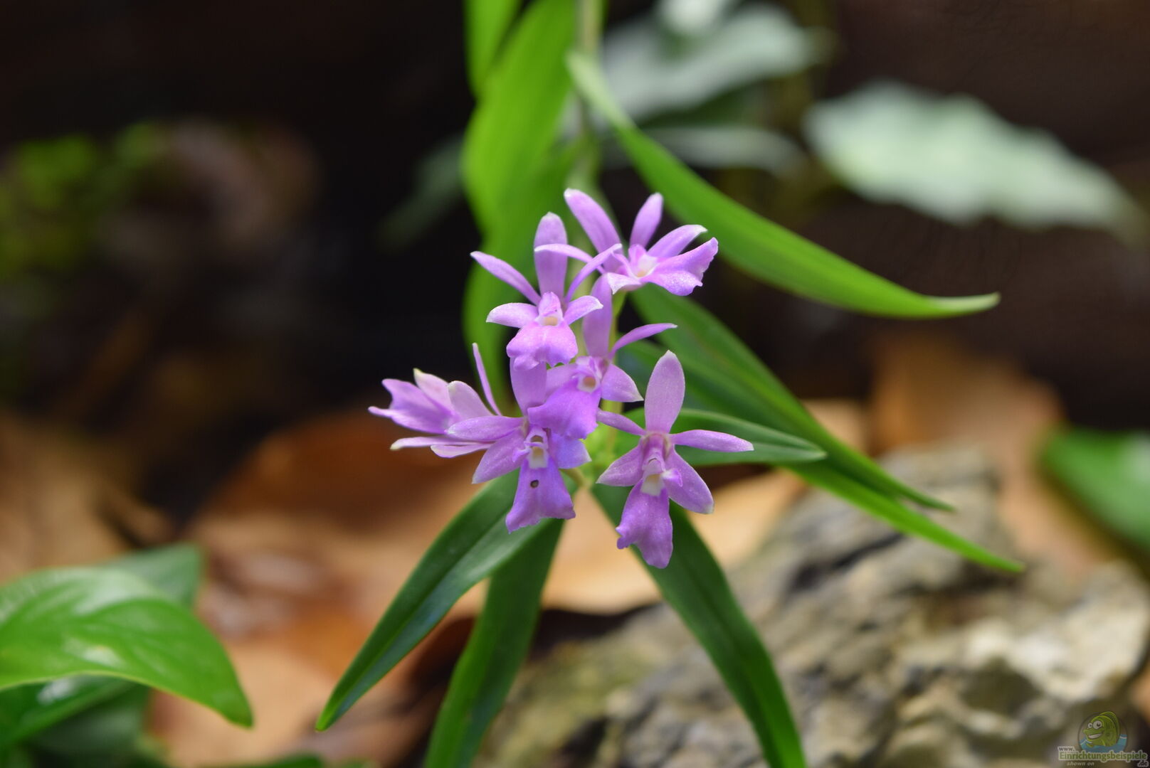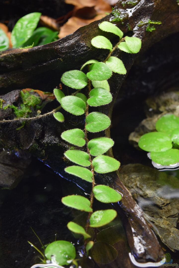 Eine kleine Teichpumpe im linken hinteren Eck versorgt den kleinen Wasserfall. in der Mitte des Beckens. Mithilfe der verwendeten Materialien entsteht so ein gute Filterwirkung. Die Pumpe und der Heizstab sind in einem Hohlraum versteckt, der durch eine grosse Xaximplatte und Pinienrinde abgedeckt ist.