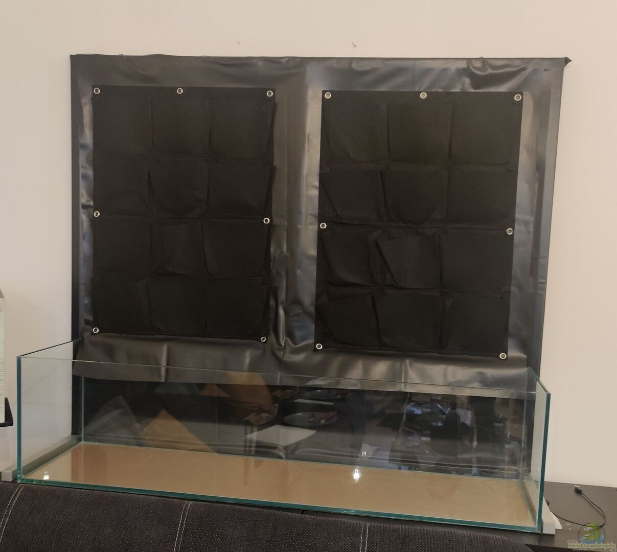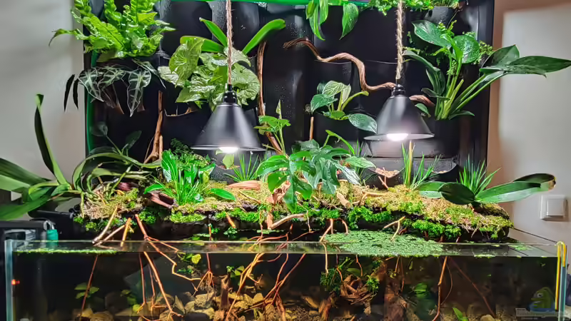 Auf der Rückseite des Aquariums befindet sich ein Alu-Stecksystem, welches mit einer Teichfolie bespannt ist. Die Teichfolie geht bis ins Aquarium und dichtet somit die Rückwand vollständig ab. Um einen ??bergang zwischen Aquarium und Rückwand zu schaffen, wurde eine 3D-Rückwand mit Montageschaum gestaltet. Dort befindet sich neben drei Einfassungen für Pflanzen im Landteil ebenfalls die Pumpe, welche mit einer Zeitschaltuhr gesteuert mehrere Male am Tag die Rückwand mit Aquariumwasser bewässert. Auf der Rückwand selber sind Pflanzmatten aus Filz befestigt, die dann mit Blähton befüllt wurden.