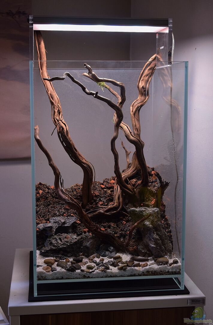 Das Hardscape besteht aus Seiryu Stones und Talawa Wurzeln. Im Vordergrund ist ein kleiner Sandstrand mit Rundkieseln.