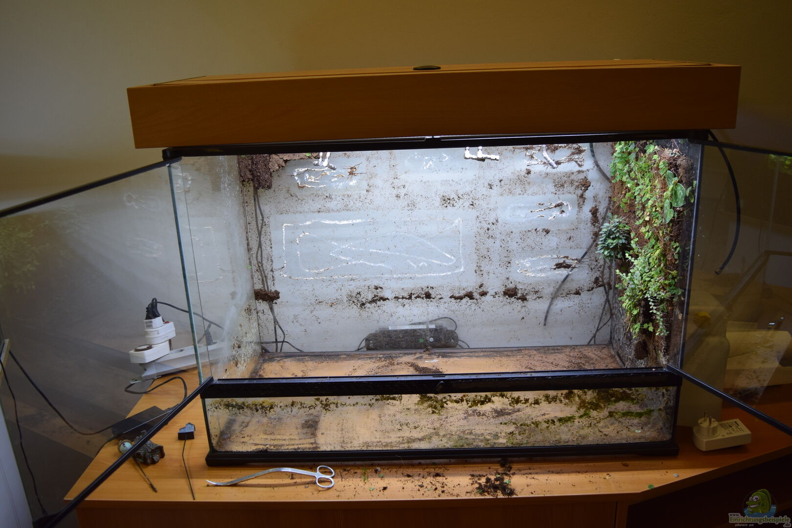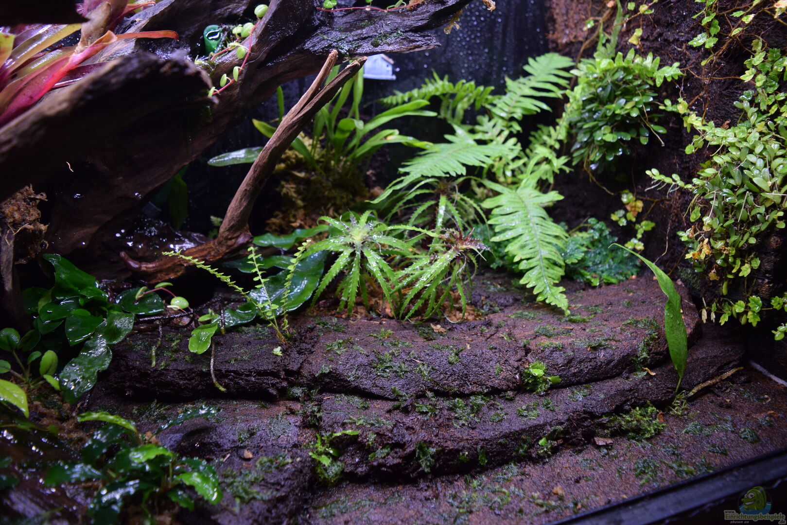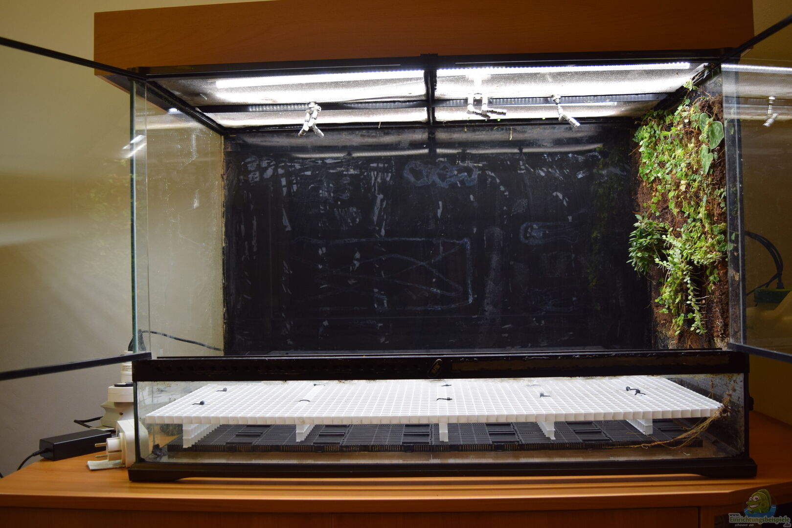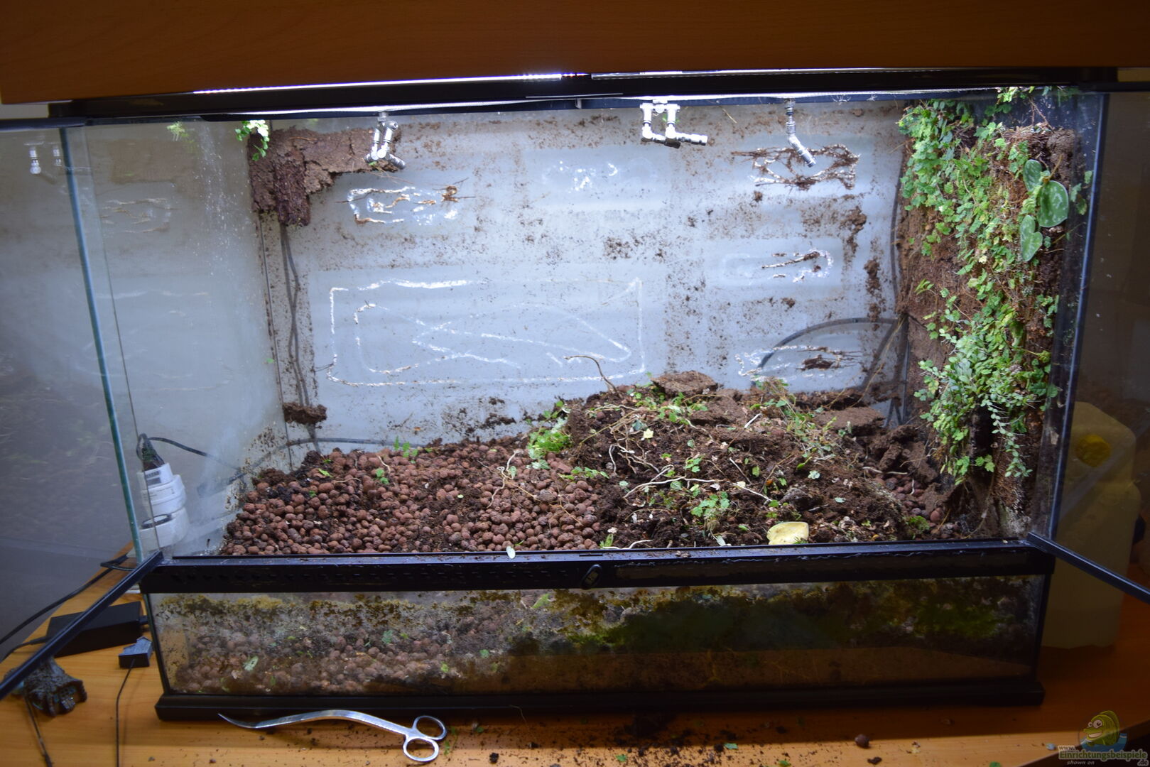 Die Besonderheit liegt bei diesem Becken in seinem doppelten, und wasserdurchlässigen Boden. Die unteren 10 cm sind mit Wasser gefüllt und werden auf ca. 24 C beheizt. Durch eine Springbrunnenpumpe wird Wasser auf 2 Leitungen hochgepumpt und über Mangrovenwurzeln geleitet. Die sollen mal alle mit Moos bewachsen (so zumindest der Plan).^^ Das Terrarium war schon seit 8 Jahren in Betrieb und hiess früher Urwäldchen. Die rechte Rückwand ist das einzige was ich unverändert übernommen hab, der Rest ist neu.