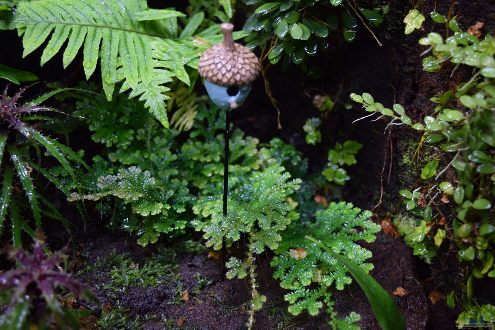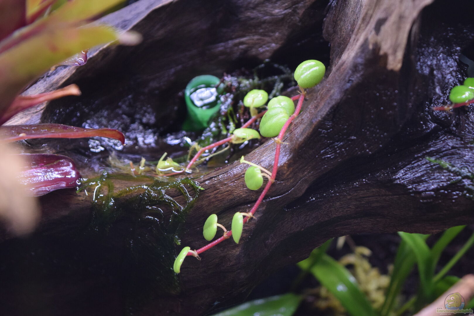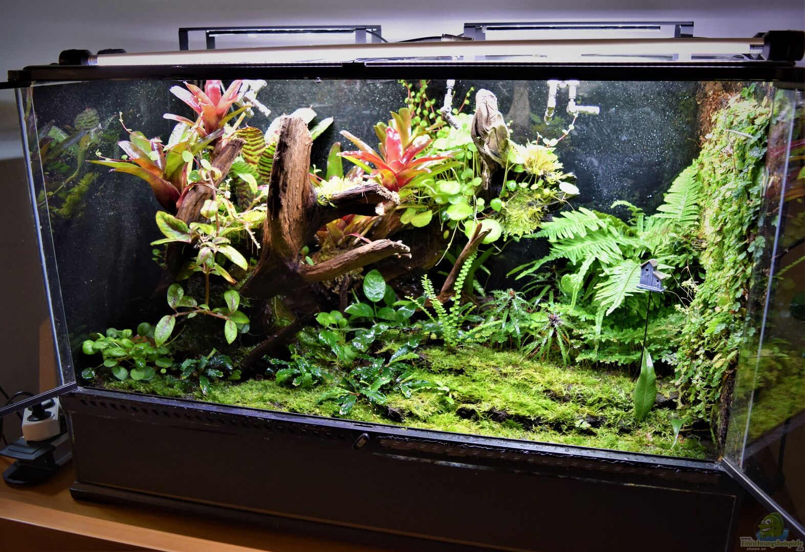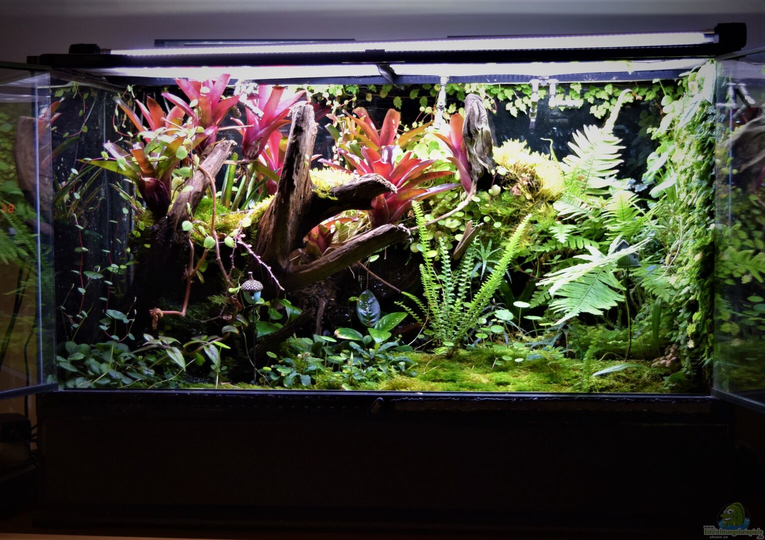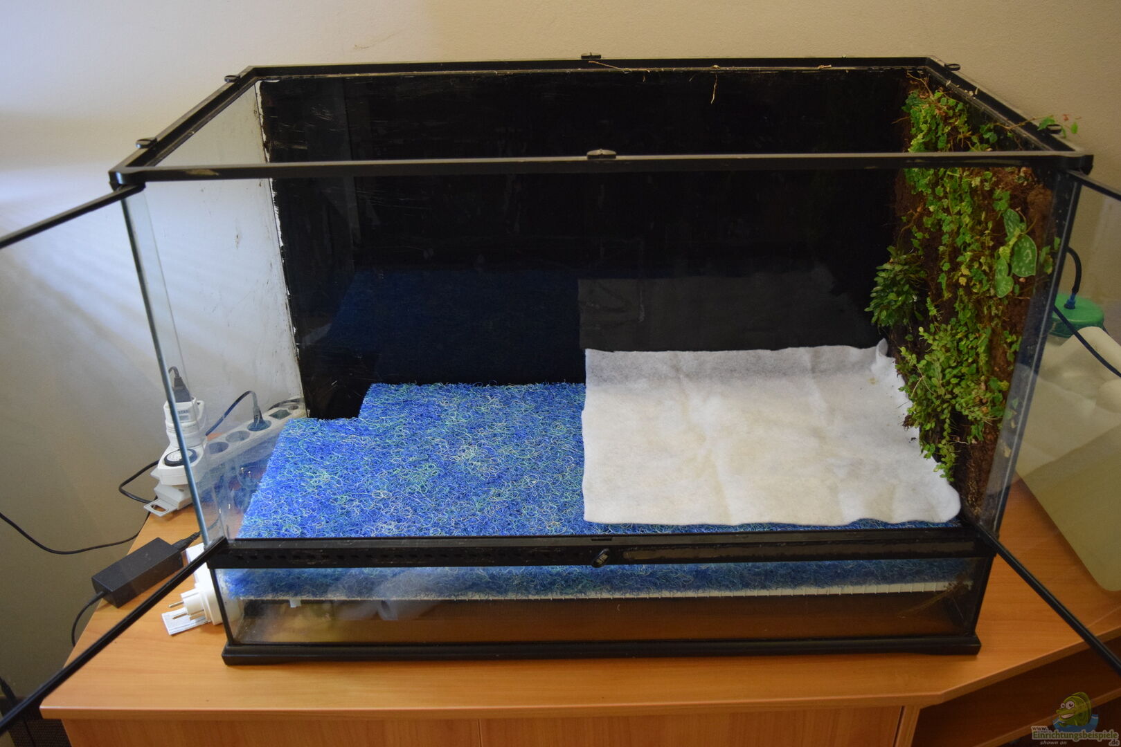 Die Besonderheit liegt bei diesem Becken in seinem doppelten, und wasserdurchlässigen Boden. Die unteren 10 cm sind mit Wasser gefüllt und werden auf ca. 24 C beheizt. Durch eine Springbrunnenpumpe wird Wasser auf 2 Leitungen hochgepumpt und über Mangrovenwurzeln geleitet. Die sollen mal alle mit Moos bewachsen (so zumindest der Plan).^^ Das Terrarium war schon seit 8 Jahren in Betrieb und hiess früher Urwäldchen. Die rechte Rückwand ist das einzige was ich unverändert übernommen hab, der Rest ist neu.