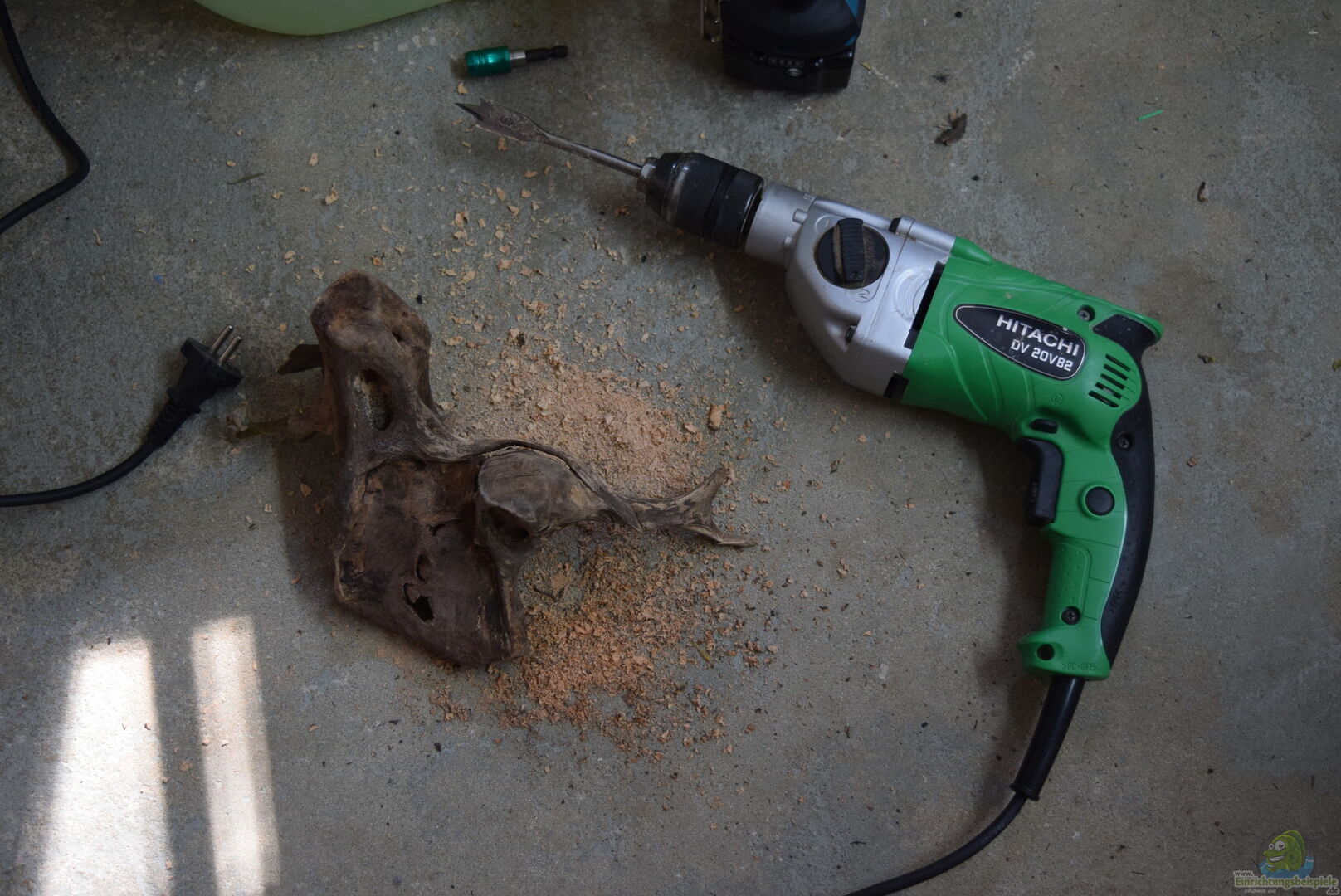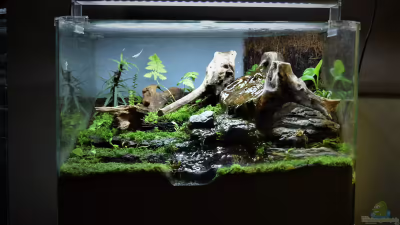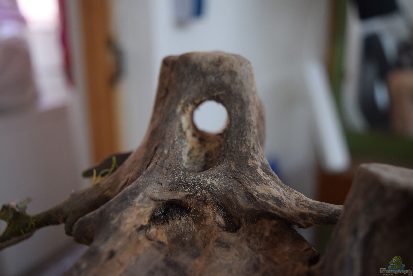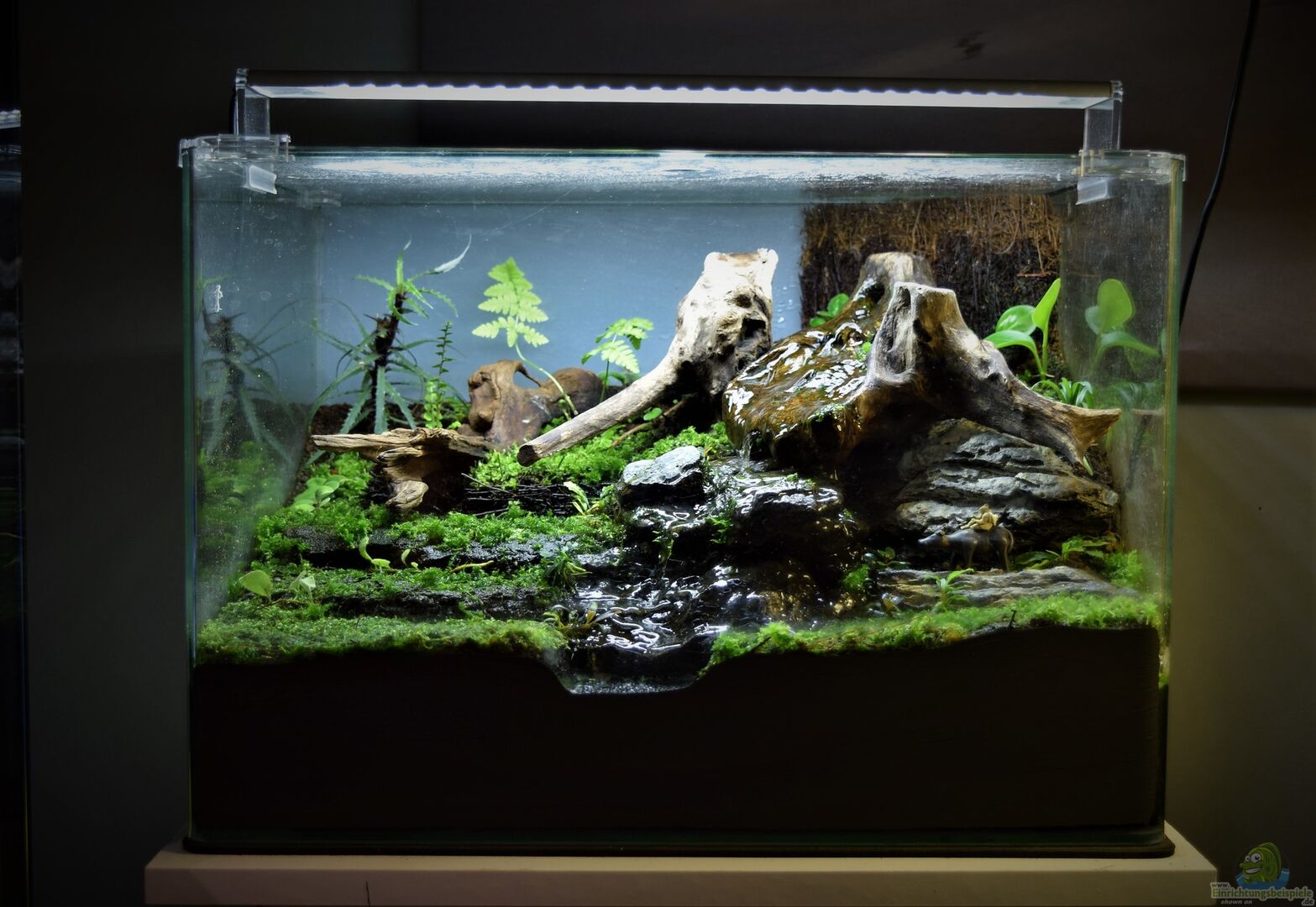 Die Besonderheit bei diesem Becken besteht aus einem Fehlboden, der als Wasserspeicher dient. Der ganze Aufbau steht auf einem Konstrukt aus Lichtstegplatten. Die Technikkammer, wenn man diese so nennen will, ist durch eine eingeklebte Xaximplatte kaschiert. Fliegengitter und Vlies liegen auf den Lichtstegplatten, um so eine Vermischung mit dem Substrat zu verhindern.