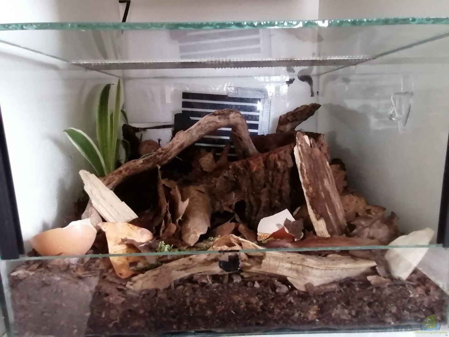 Das Terrarium ist nur von Titanasseln bewohnt. Die Asseln haben wir seit Herbst 2023, anfangs in einem Würfel mit 30cm Kantenlänge und Schiebetüren. Da der Spalt zwischen den Schiebetüren leider größer als die Asseln waren, sind uns zwei Asseln entwischt und leider im Wohnzimmerteppich vertrocknet ... Daraufhin haben wir zu diesem Terrarium mit Falltür gewechselt und haben daraus gelernt, dass für Asseln Schiebetüren ungeeignet sind.