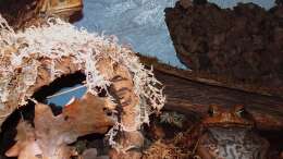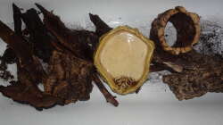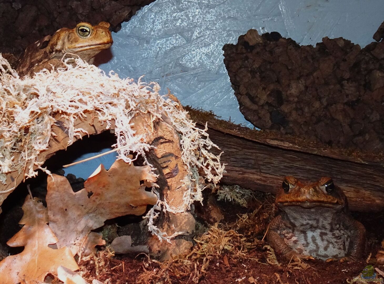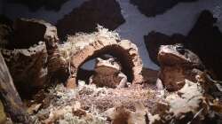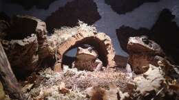Das Terrarium ist mit einer mittelgro??en Badeschale von Exo Terra , sowie mehreren Korkröhren von Trixie und selbstgesammelten ??sten und Rinden ausgestattet. Diese sind zu Verstecken gestapelt, sodass die Kröten unter ihnen verschwinden oder im besten Fall doof herausschauen können. Sie lieben diese Aufbauten, da sie gern auch mal den Boden verlassen, in die Höhe kraxeln und von oben die Aussicht genie??en.