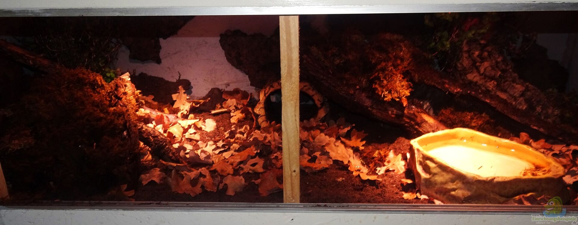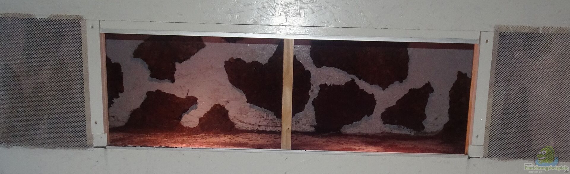 Bei diesem Terrarium handelt es sich um einen Selbstbau aus Fragmenten ehemaliger OSB-Standardterrarien. Der Korpus besteht aus OSB-Platten, welche im Innenraum wasserfest und im Au??enbereich wei?? , zum Wohnraum passend, lackiert wurden. An den Wänden befinden sich einige "Korkplattenfetzen", um etwas Abwechslung in der Gestaltung zu schaffen und nicht kostbare Zentimeter mit dicken Rückwänden, welche wenig Nutzen in dieser Haltung hätten, zu verschwenden. Belüftet wird das Ganze durch Lüftungsgitter an den Seiten sowie durch die Aluminiumgitter jeweils rechts und links im Frontbereich.