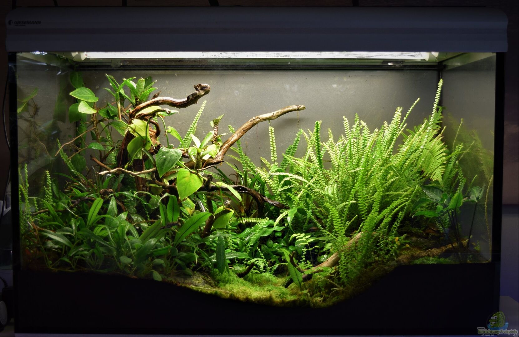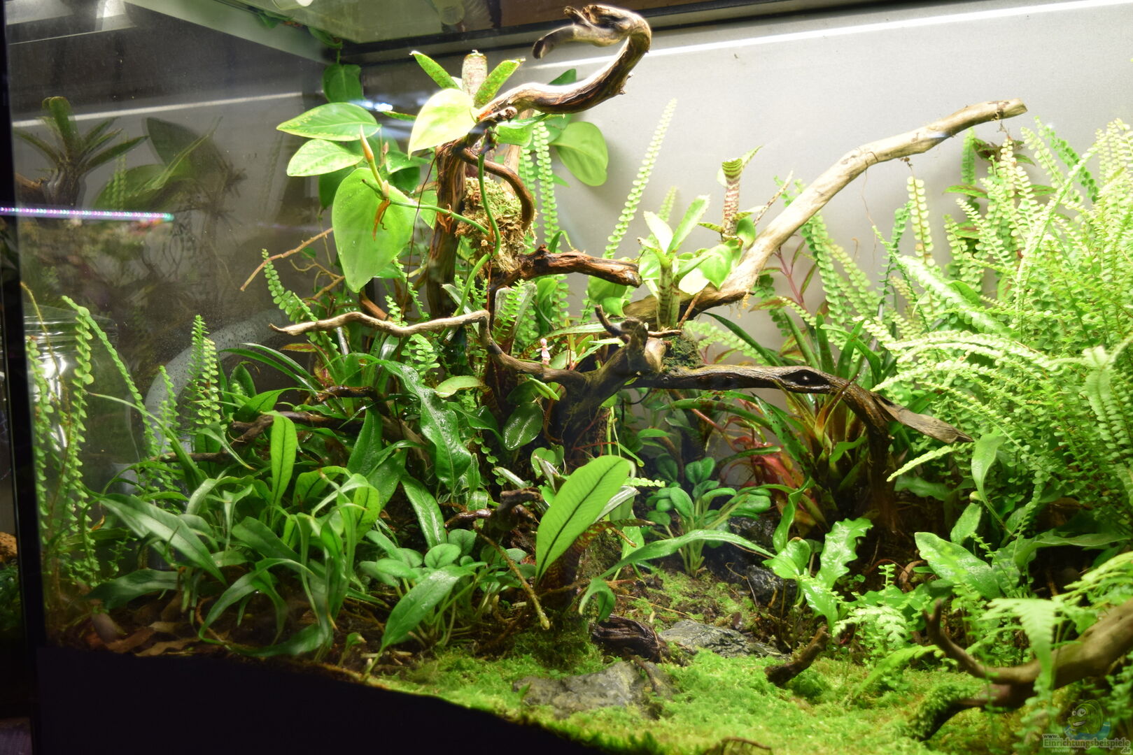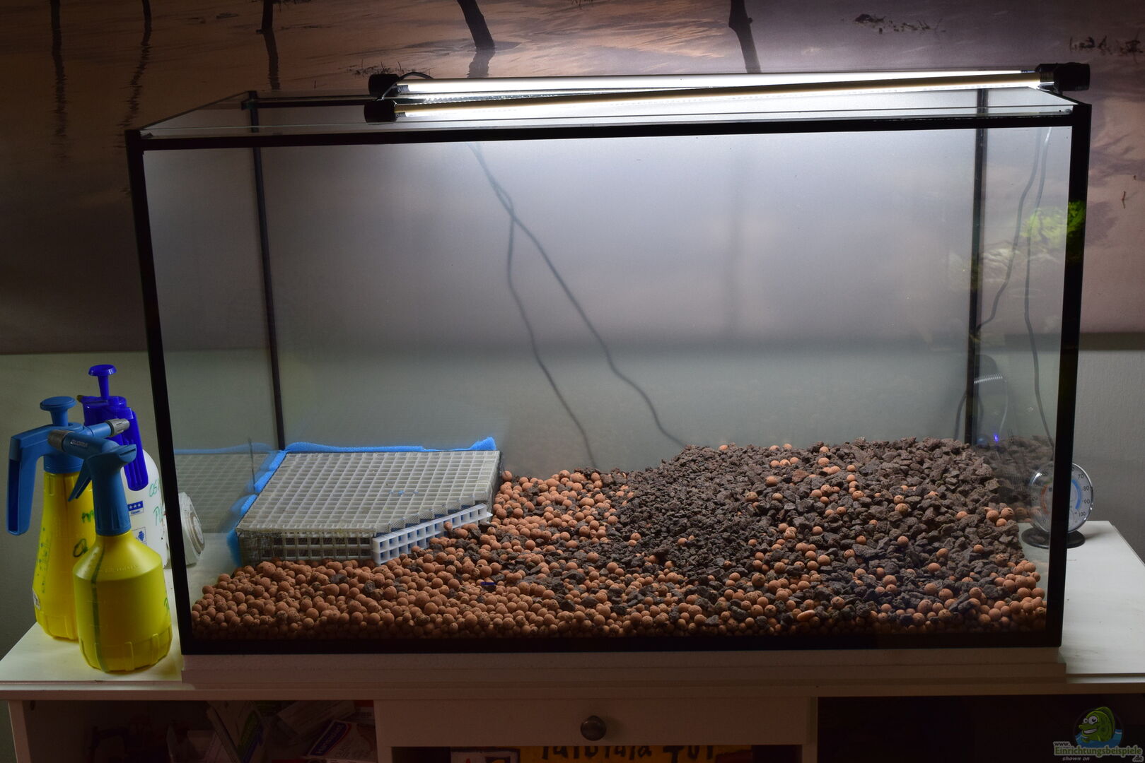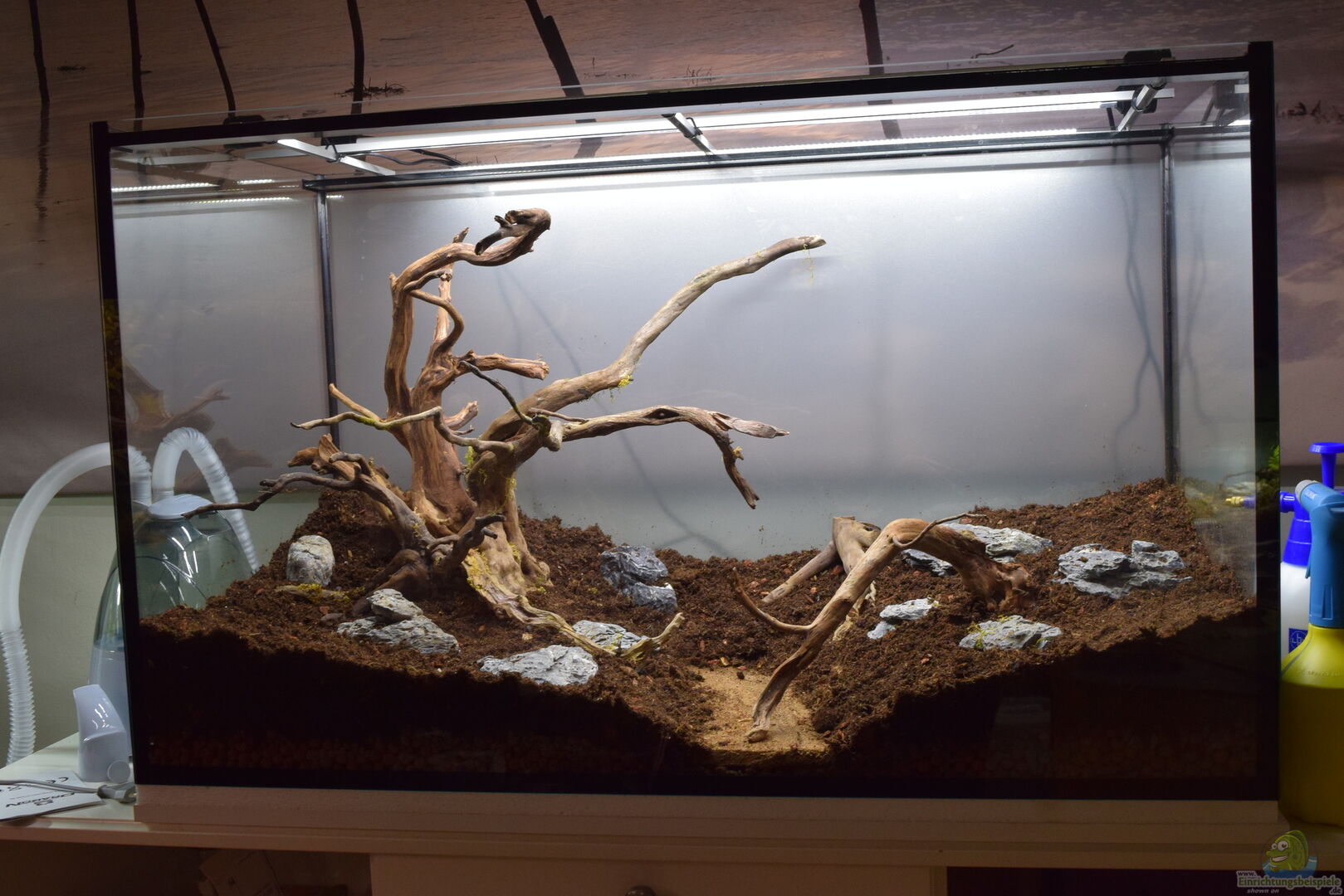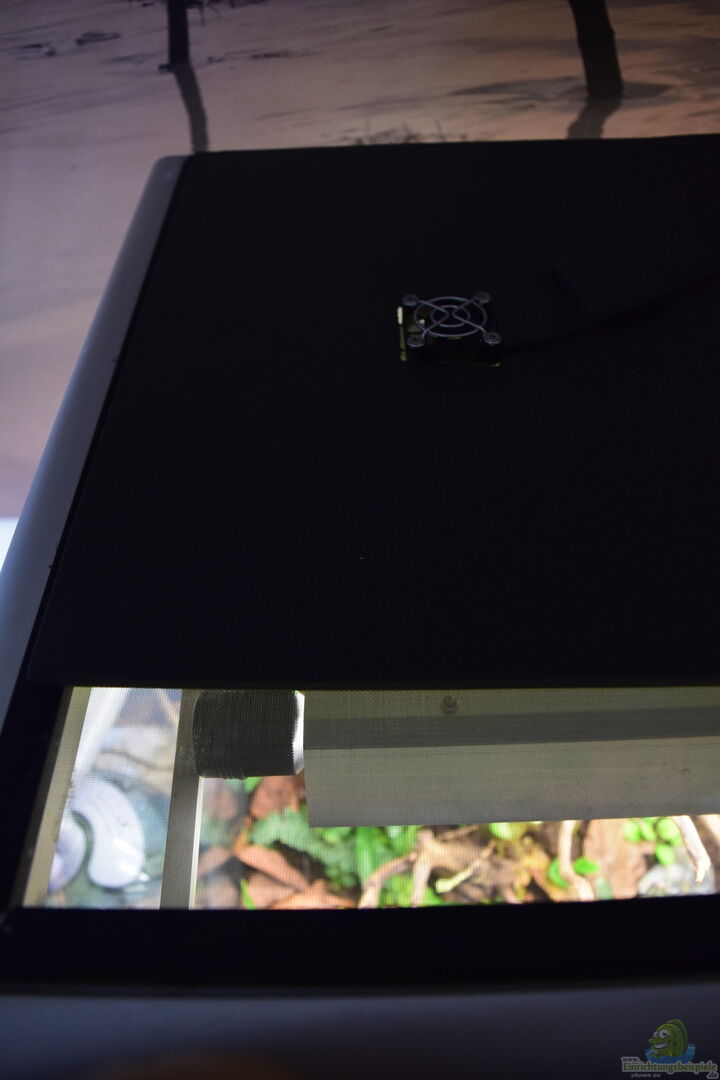 Die Besonderheit liegt darin, dass hier ein Aquarium als Terrarium gestaltet wird. Da kein Luftaustausch von unten nach oben durch Lüftungsschlitze stattfinden kann, wird hier mit PC-Lüftern gearbeitet, um dies zu bewerkstelligen. Der Gedanke war, freie Sicht auf das Terrarium zu haben, ohne störende Schiebscheiben, Lüftungsschlitze o.ä.