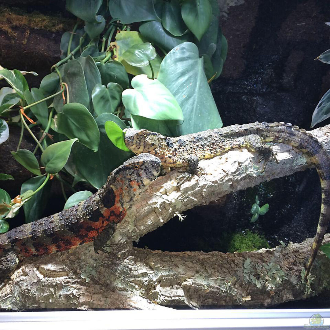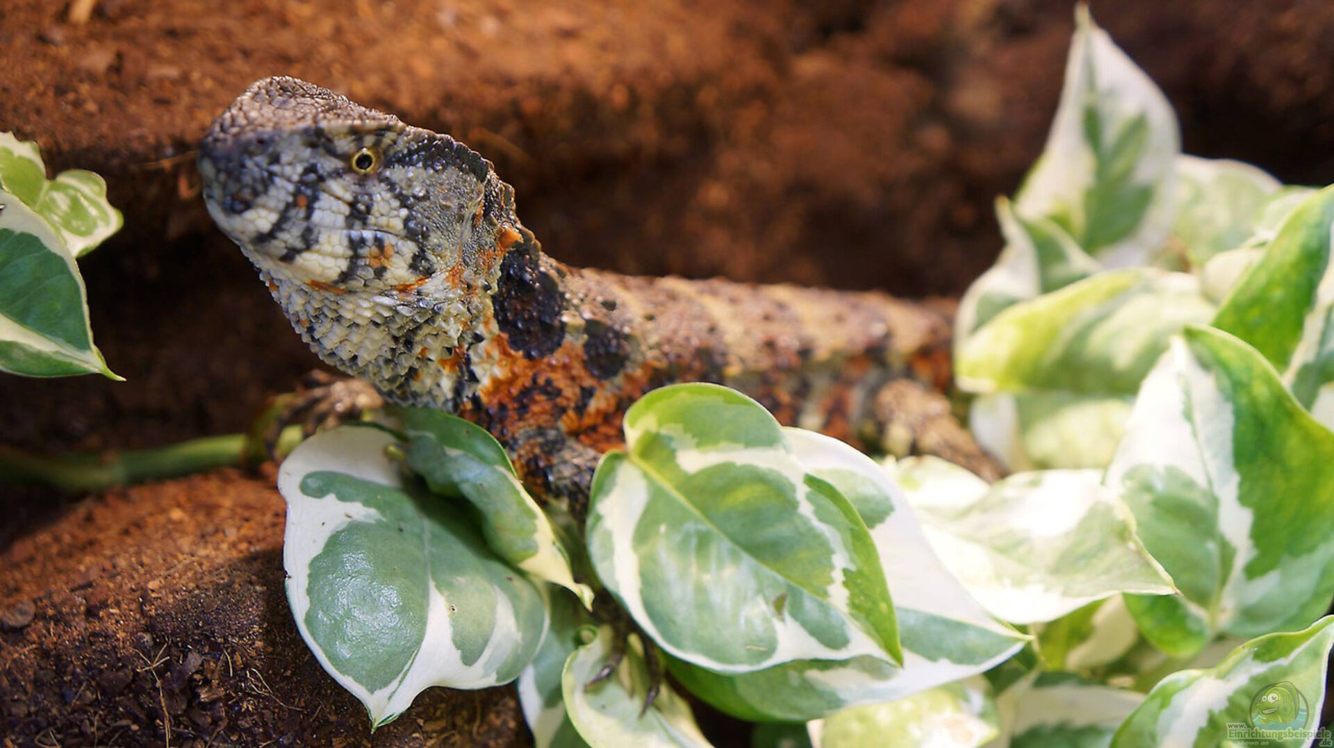 - Terrariengröße: Für ein einzelnes Tier sollte das Terrarium mindestens 150 cm lang, 60 cm tief und 60 cm hoch sein. Da diese Art sehr territorial sein kann, empfiehlt sich für Paare ein deutlich größeres Becken mit klar abgegrenzten Rückzugsbereichen.