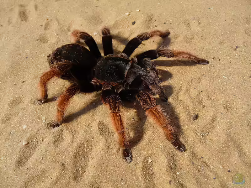 Brachypelma boehmei (Boehmei-Vogelspinne) ist eine Vogelspinne, die ursprünglich in langen Wohnröhren in sehr heißen Gebieten Mexikos vorkommt, um der Hitze zu entkommen.