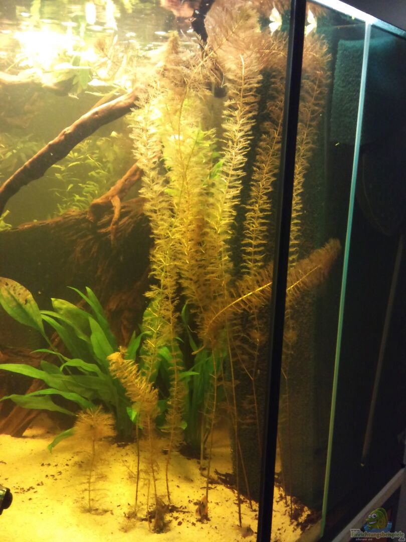 Die Pflanze hat filigrane, fiederartige Blätter, die eine leuchtend grüne Farbe aufweisen. Die Blätter sind in dichte Rosetten angeordnet und können bis zu 20 cm lang werden, wobei sie sich elegant im Wasser ausbreiten. Bei optimalen Bedingungen kann das Mato-Grosso-Tausendblatt auch eine beachtliche Wuchshöhe erreichen und dabei ein üppiges, dekoratives Erscheinungsbild bieten.