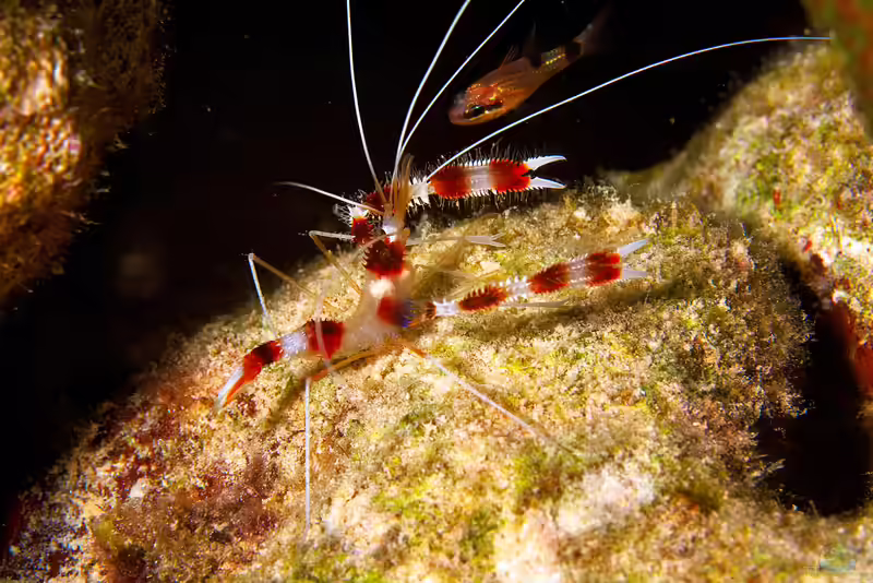 Bei Stenopus hispidus (Gebänderte Scherengarnele) handelt es sich um eine Garnele aus der Familie der Stenopodidae, die ursprünglich aus dem Roten Meer und dem Indo-Pazifik stammt. Dort ist sie in 1 bis 290 Metern Tiefe zu finden.