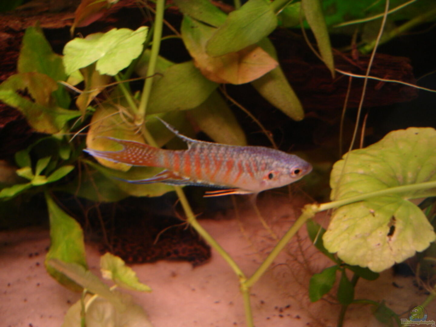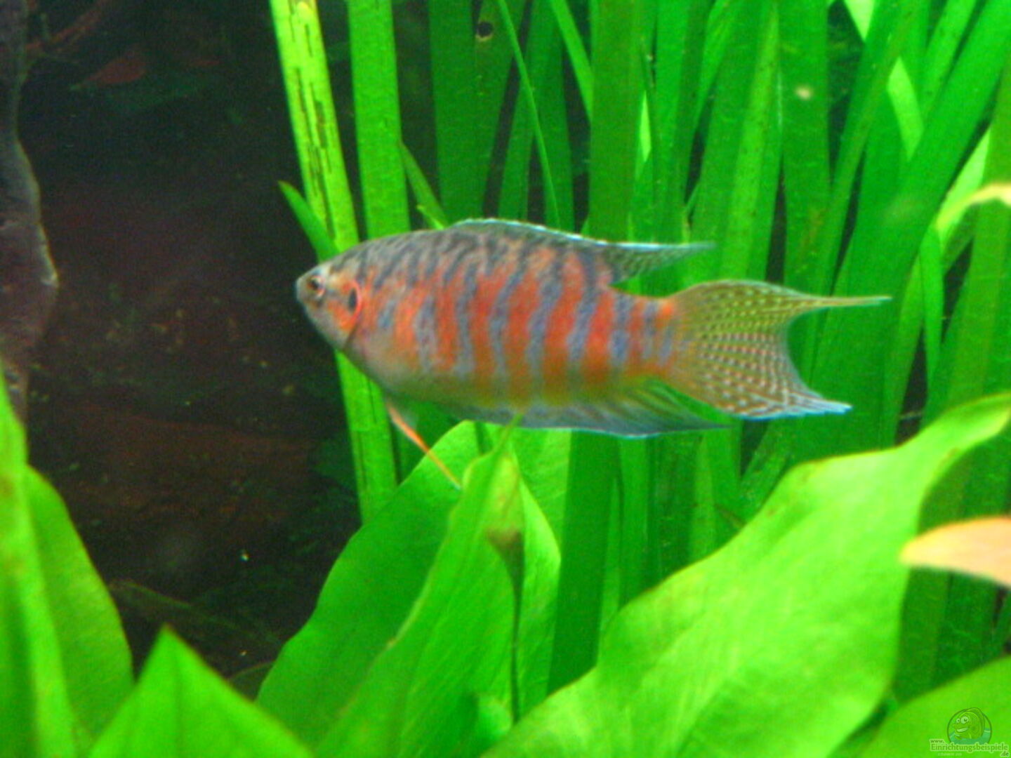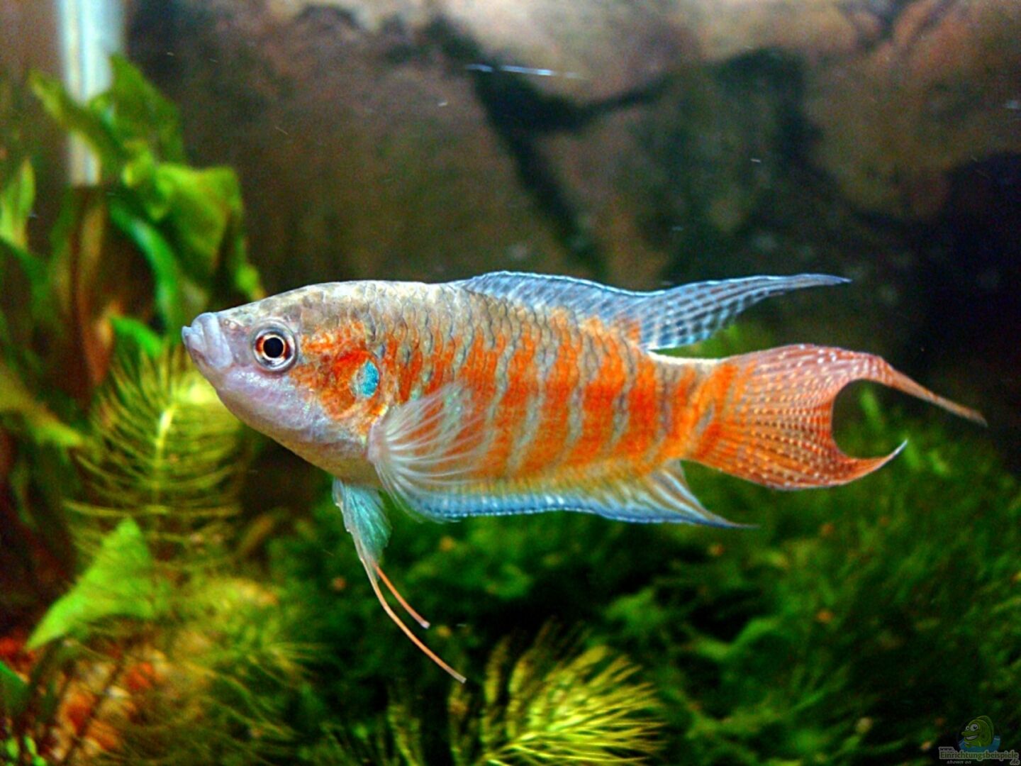 Macropodus opercularis (Paradiesfisch) ist ein Labyrithfisch, der ursprünglich aus Ostasien Macropoden gelten als sehr robust und können auch mit ihrem Labyrithorgan atmosphärische Luft atmen. Sie sind allerdings auch etwas ruppig, so dass sie nicht mit zu empfindlichen Arten vergesellschaftet werden sollten.