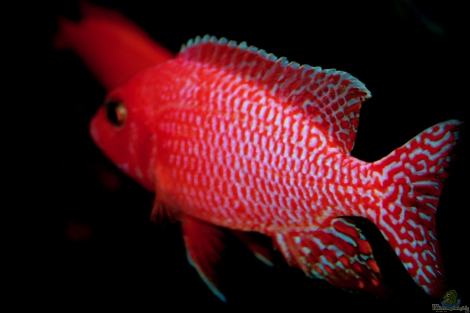 Der Aulonocara Firefish ist ein echter Blickfang im Aquarium. Er zeichnet sich durch eine leuchtende Kombination aus intensivem Rot, Orange und manchmal leichtem Violett oder Blau aus, je nach Zuchtlinie. Die Farben treten bei ausgewachsenen Männchen besonders stark hervor, während Weibchen meist dezenter gefärbt sind – silbrig-grau bis blass orange.