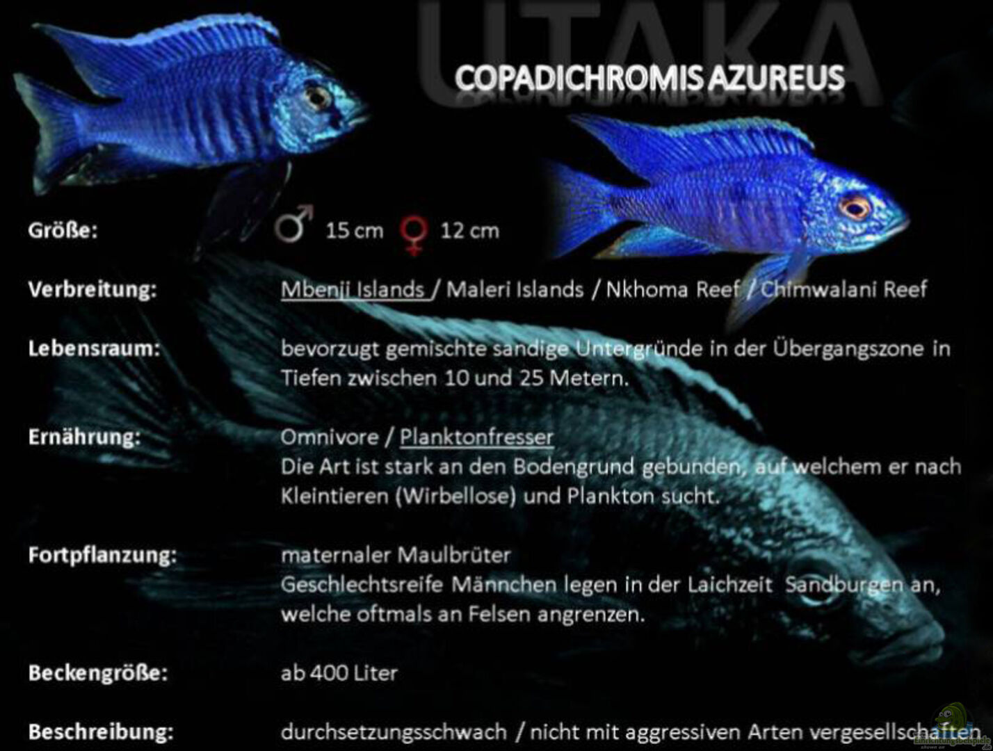Ursprünglich stammt Copadichromis azureus aus dem ostafrikanischen Malawisee und gehört zur Gruppe der Utakas.