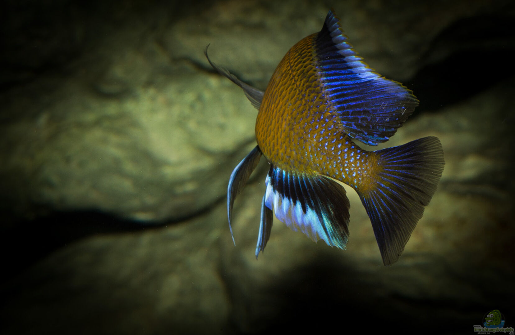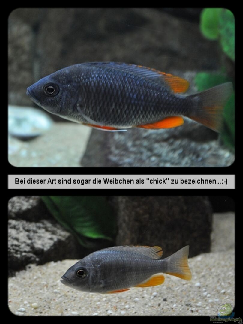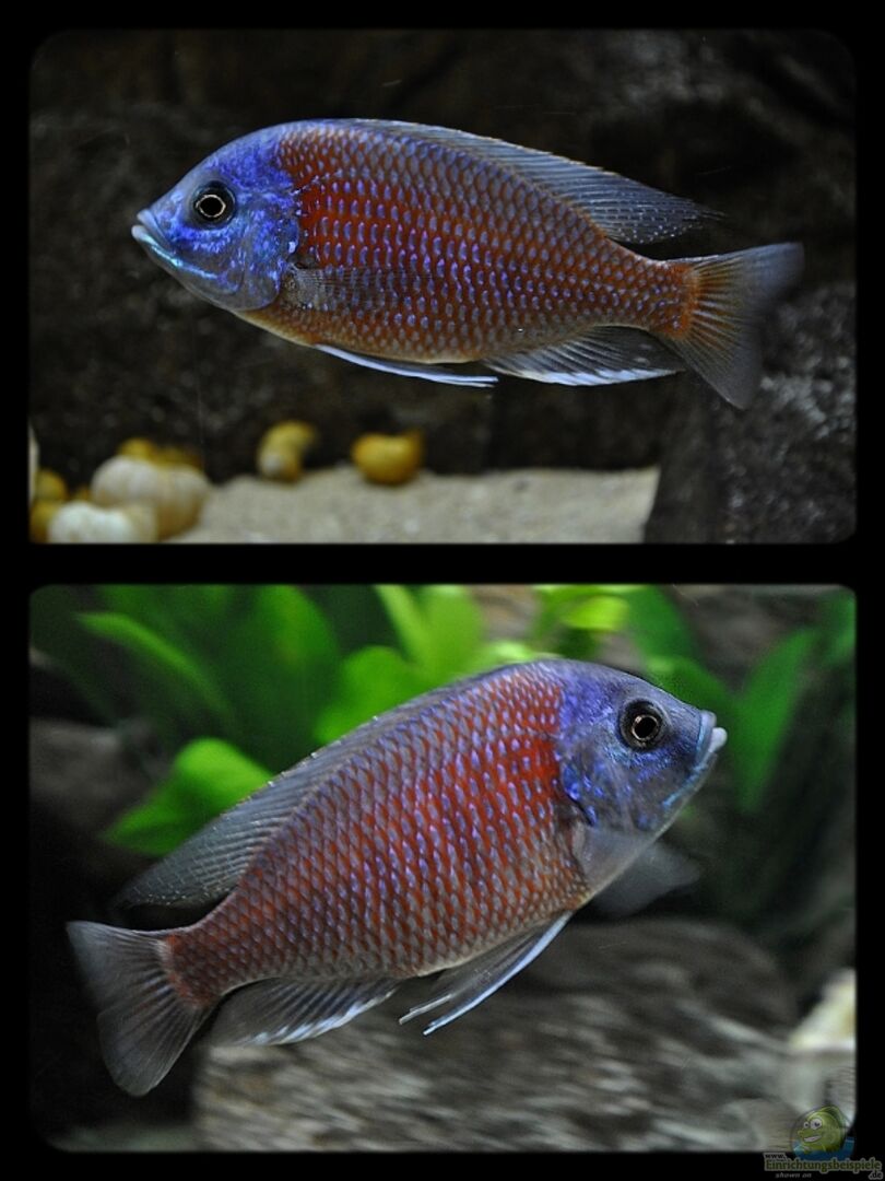 Juvenile Tiere und Weibchen zeigen ein deutlich schlichteres Erscheinungsbild, was eine geschlechtsdifferenzierte Haltung sinnvoll macht, um die Pracht der Art im Aquarium zu erleben.