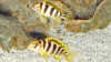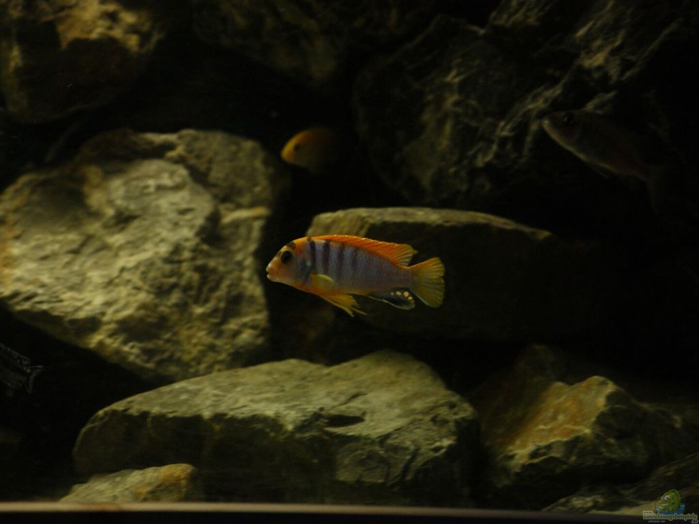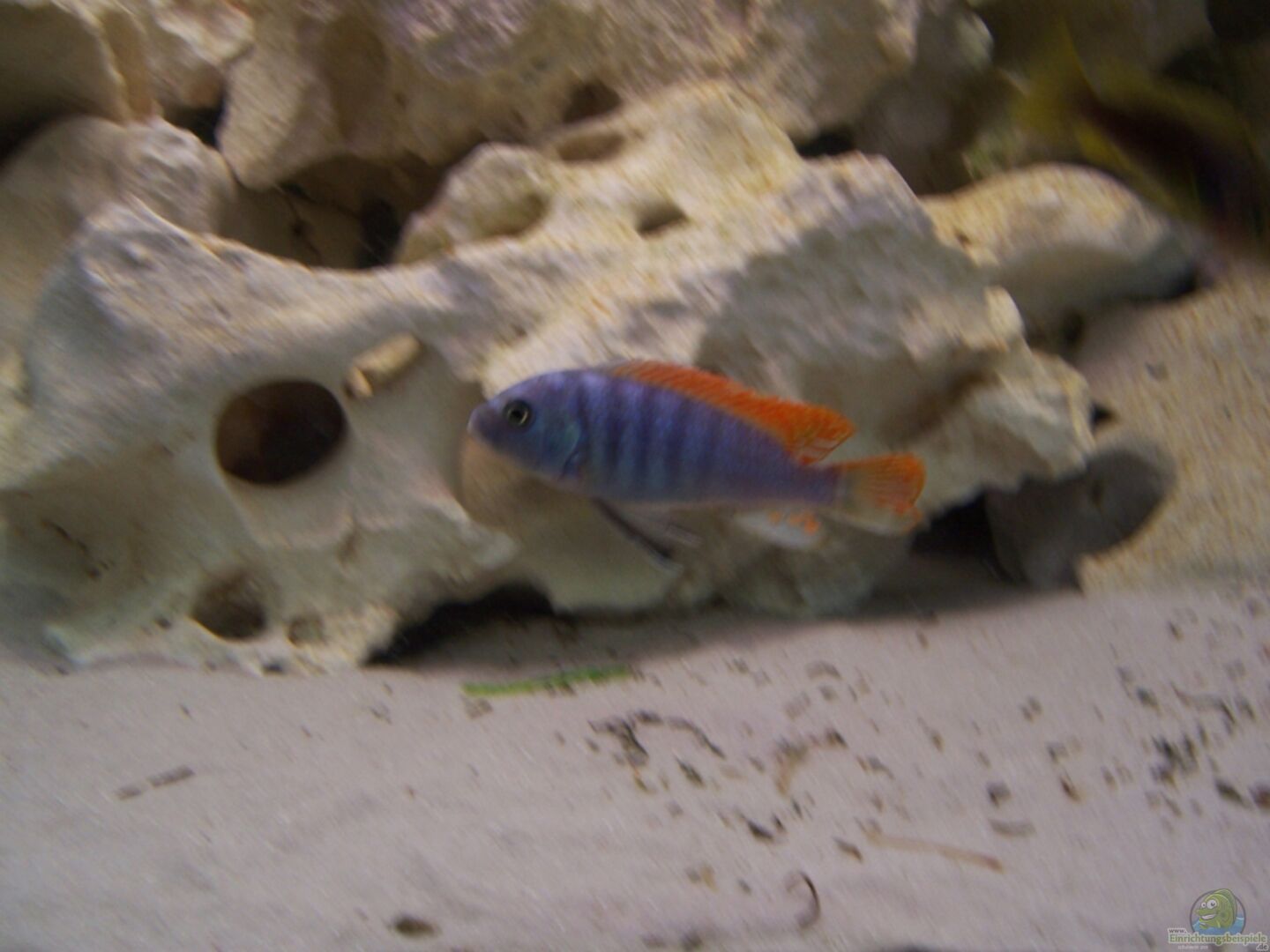 - Labidochromis sp. „Hongi“ Diese Art besticht durch ihre blau-schwarzen Streifen und einen orangen oder roten Kopf. Die Farben können je nach individueller Stimmung und Wasserbedingungen intensiver oder blasser erscheinen. Der Hongi gilt als lebhafter, aber relativ friedlicher Fisch.