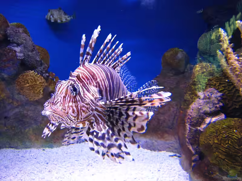 Bei Pterois volitans (Rotfeuerfisch) handelt es sich um einen Skorpionfisch (Scorpaenidae), der ursprünglich aus dem Roten Meer, dem Indopazifik, dem Atlantik und der Karibik stammt.