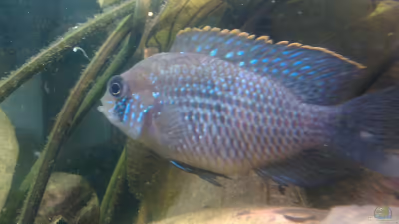 Beide Geschlechter haben eine markante, schwarze Fleckenbildung auf den Wangen, die oft als "Augenfleck" bezeichnet wird. Die Augen selbst sind relativ groß und haben eine goldene Iris. Insgesamt sind Blaupunkt-Buntbarsch sehr attraktive Fische mit einer Vielzahl von Farben und Mustern, die sie zu beliebten Haustieren in der Aquaristik machen.