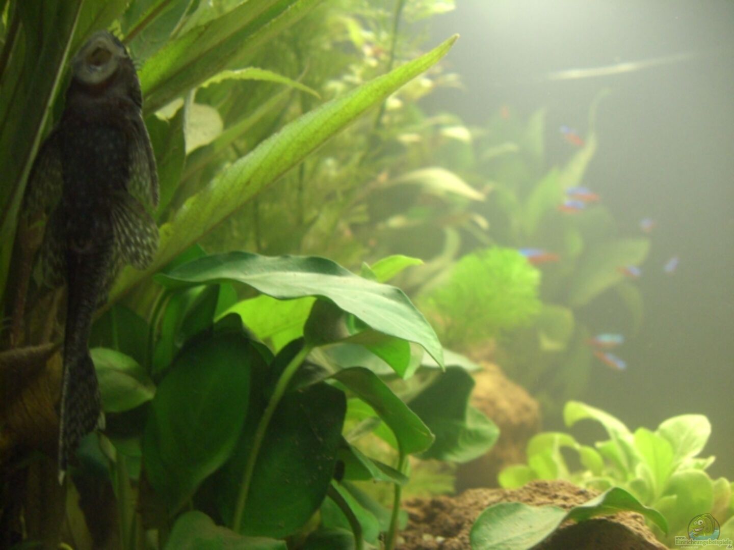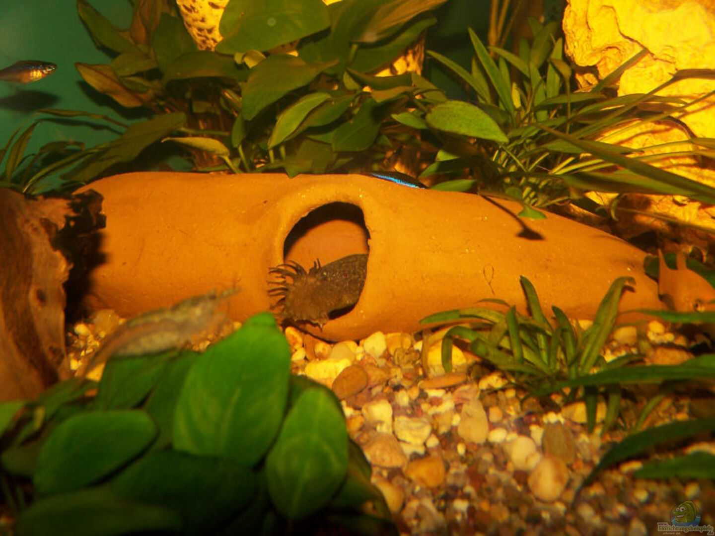 - Dichte Bepflanzung (z. B. Anubias, Javafarn, Cryptocorynen)