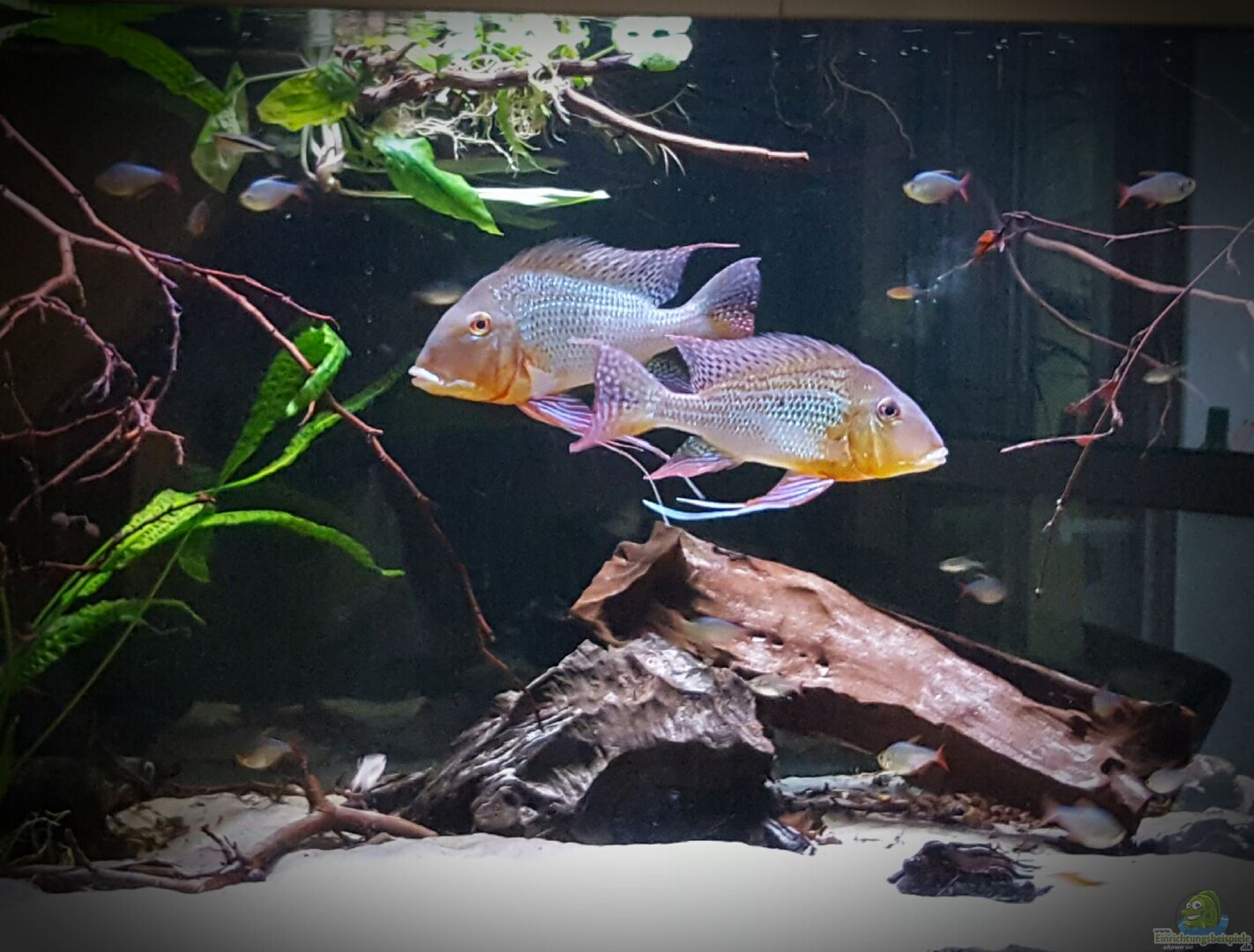 Ein feiner Sandboden ist Pflicht, damit das Erdfresser-Verhalten ohne Verletzungsrisiko ausgeübt werden kann. Als Dekoration eignen sich Wurzeln, glatte Steine und robuste Pflanzen wie Javafarn oder Anubias. Pflanzen werden meist in Ruhe gelassen, allerdings kann durch das Wühlen der Bodengrund stark aufgewühlt werden – gut verwurzelte oder aufgebundene Pflanzen sind ideal.