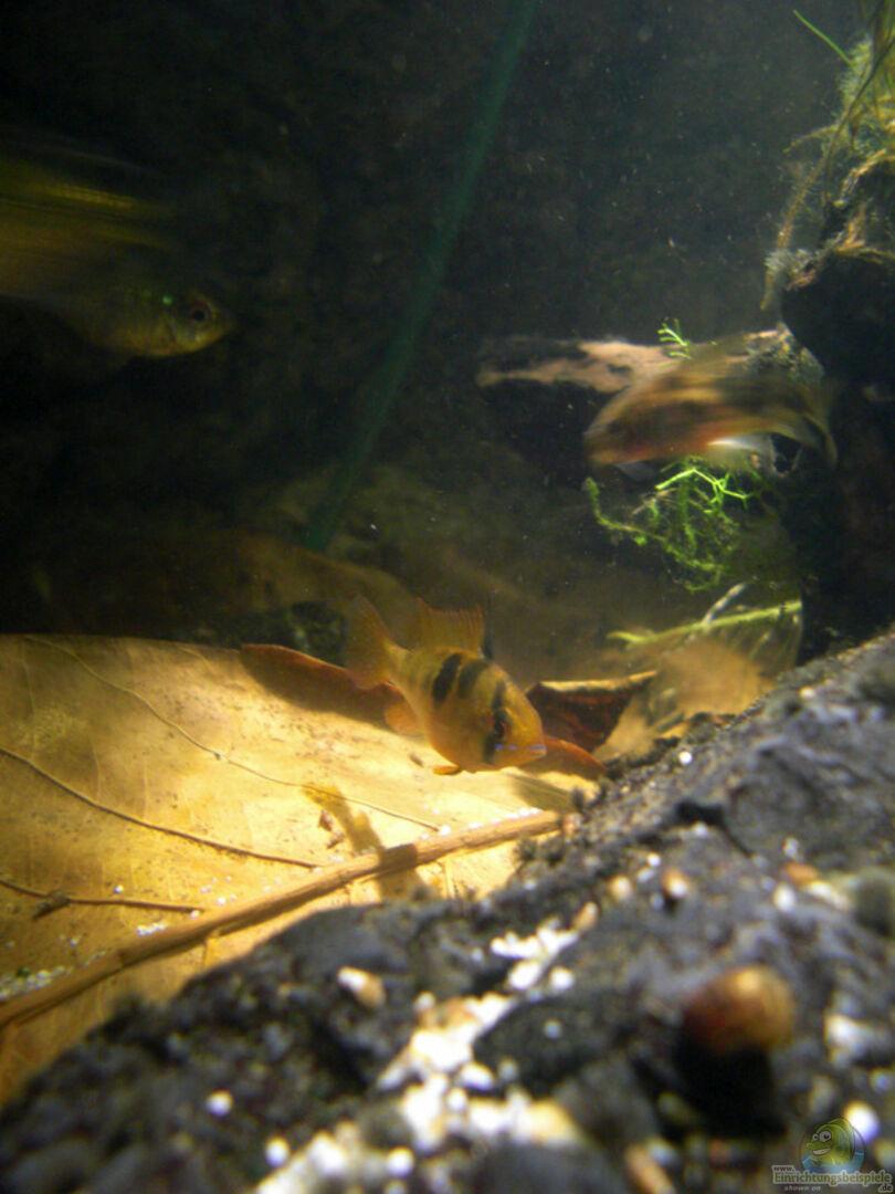 Wenn es mit einer Eiablage geklappt hat, schlüpfen die Larven nach ca. 2 bis 3 Tagen. Die Larven werden von den Elterntieren dann in vorbereitete Gruben umgebettet. Nach etwa 1 Woche schwimmen die Jungfische dann frei und können mit Artemia-Nauplien aufgezogen werden.